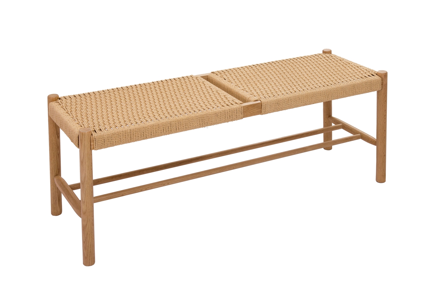 Denne bænk er fremstillet i egetræ med lakfinish, hvilket giver dig en robust konstruktion, der holder i mange år. Egetræet er anerkendt for sin styrke, mens lakfinishen skaber en beskyttende overflade, der er nem at vedligeholde. Den vævede sædeoverflade er opdelt i to sektioner og kombinerer funktionalitet med et kunstnerisk udtryk.