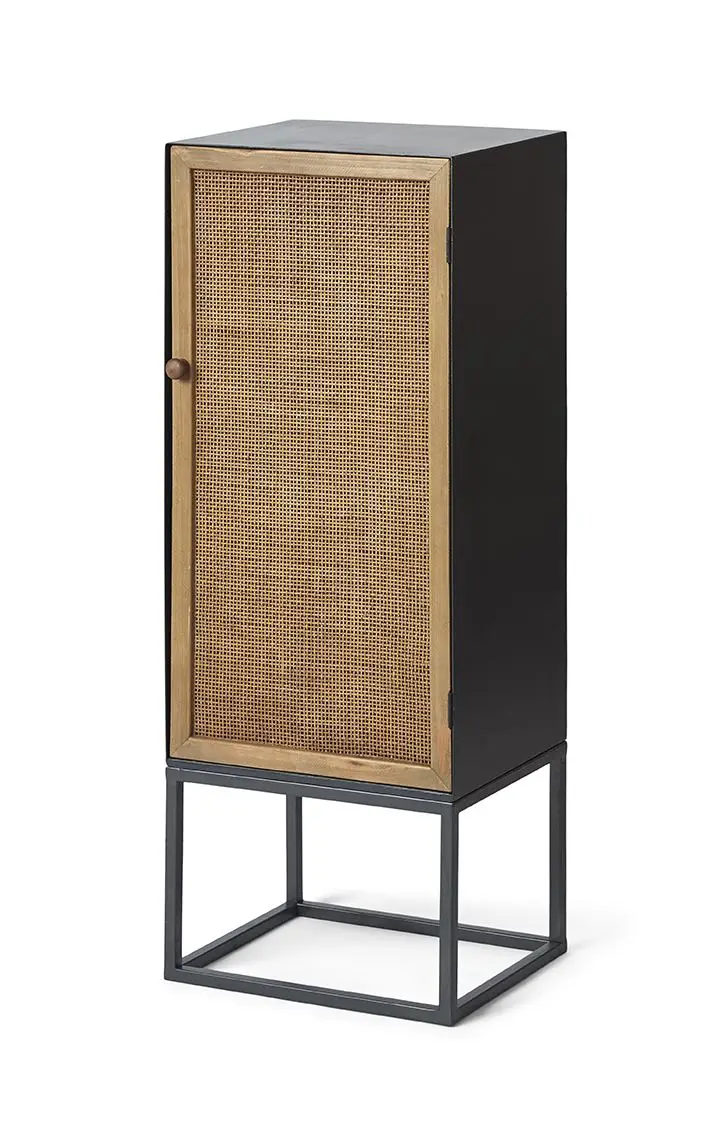 Det sorte ydre fungerer som en ramme omkring det vævede panel, hvilket gør skabet nemt at integrere i dit hjem. Metalrammen løfter skabet fra gulvet og giver et luftigt udtryk. Dimensionerne på 110x40x35 cm betyder, at du kan placere det i stuen, soveværelset eller entréen, hvor det giver opbevaring uden at dominere.