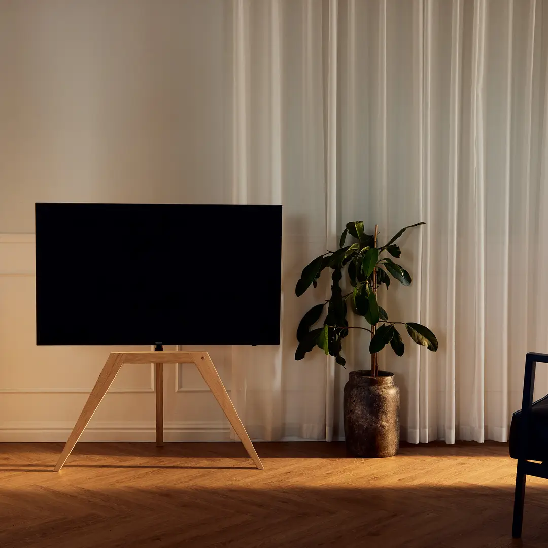 Denne TV-stander fra Andersen Furniture er fremstillet i massivt egetræ og understøtter TV'er mellem 40 og 60. Standeren har en vægtkapacitet på 30 kg og passer til VESA-standarder fra 100 til 400. Det minimalistiske, trekantede design giver din stue et naturligt udtryk, mens benene med deres smukke tapetseringer tilføjer håndværksmæssige detaljer.