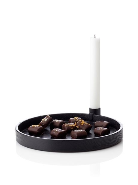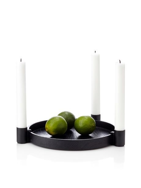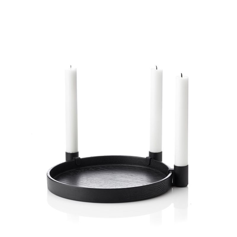 Fin lysestage fra Applicata. LUNA lysestagen består af en bakke i røget eg med 4 holdere i messing til lys. Holderne kan flyttes eller tages helt af. LUNA lysestagen kan bruges til hverdag, fest eller højtider