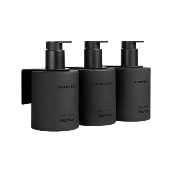 KIREI-glasflasker tilbyder optimal opbevaring, og disse robuste og stilfulde glasflasker bevarer kvaliteten af dine plejeprodukter. De tre flaskedesigns giver dig mulighed for at skelne mellem shampoo, showergel og balsam, og kan købes som et sæt med tre eller enkeltvis. Et metalvægbeslag med en matsort pulverlakering, der perfekt matcher de matsorte pumpehoveder, medfølger også i leveringen. Det kan bruges til at skrue eller lime flaskerne på væggen. De er dog også et blikfang, når de placeres i en brusekabine eller på kanten af badekarret. Det medfølgende klæbesæt muliggør installation uden at bore. Se venligst installationsvejledningen i manualen. Leveringen indeholder et sæt bestående af tre genopfyldelige pumpeflasker og vægbeslag med følgende etiketter: SHAMPOO, BALSAM og SHOWER GEL.
