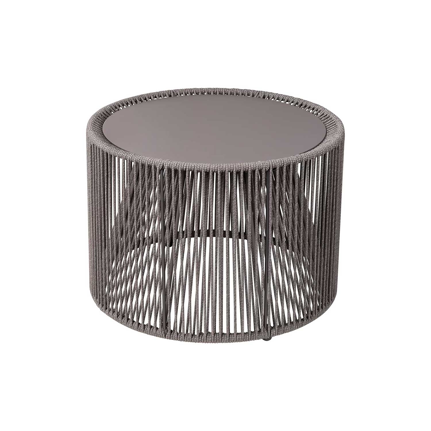 Den symmetrisk oprullede rebkonstruktion skaber en cylindrisk base, der giver bordet struktur og visuelt flow. Bordpladen er farvekoordineret med rebene i coal/grå, så alle elementer harmonerer. Denne konstruktion er ikke kun æstetisk; den bidrager også til bordets stabilitet og robusthed i daglig brug.