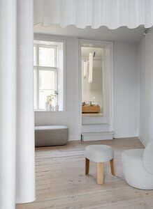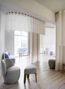 KUON – En afrundet form, indbydende og behagelig. Sådan beskrives den nye KUON polstrede møbelserie. Bestående af 2 skamler, i lys og bejdset eg, 2 lænestole, med og uden drejefunktion, samt en 2-personers, giver den forskellige anvendelsesmuligheder. Serien, designet af den japanske designer Kazushige Miyake, har et bæredygtigt bouclé-tekstil.