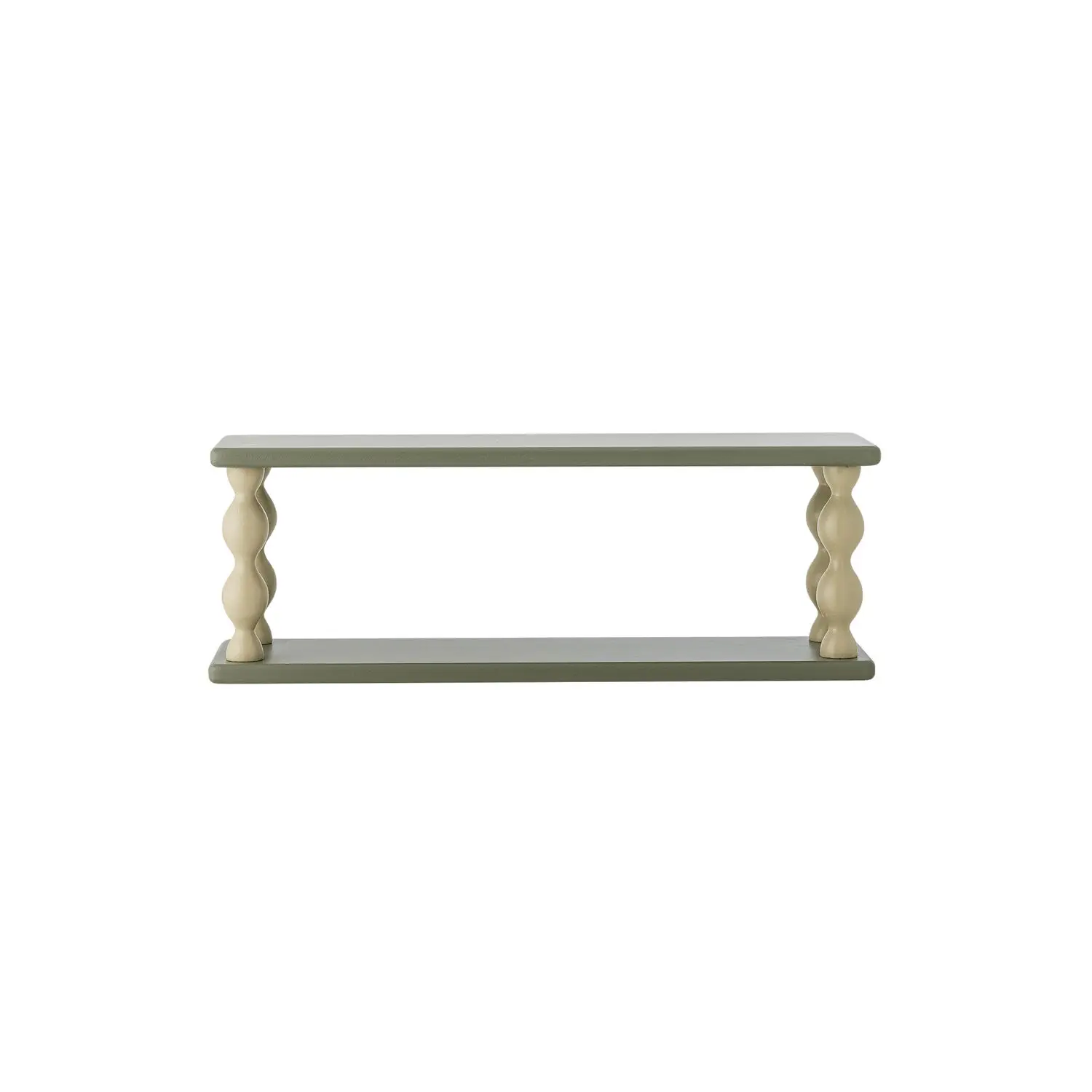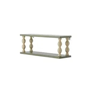Denne vægmonterede hylde fra Bloomingville kombinerer 70 % MDF med 30 % brænde, hvilket giver en stabil konstruktion med håndværksmæssige detaljer. Hylden måler 60 x 21,5 x 17 cm og har bølgede beige støttepiller samt metalbeslag til sikker montering. Den grønne, malede finish tilføjer et moderne farveaccent.