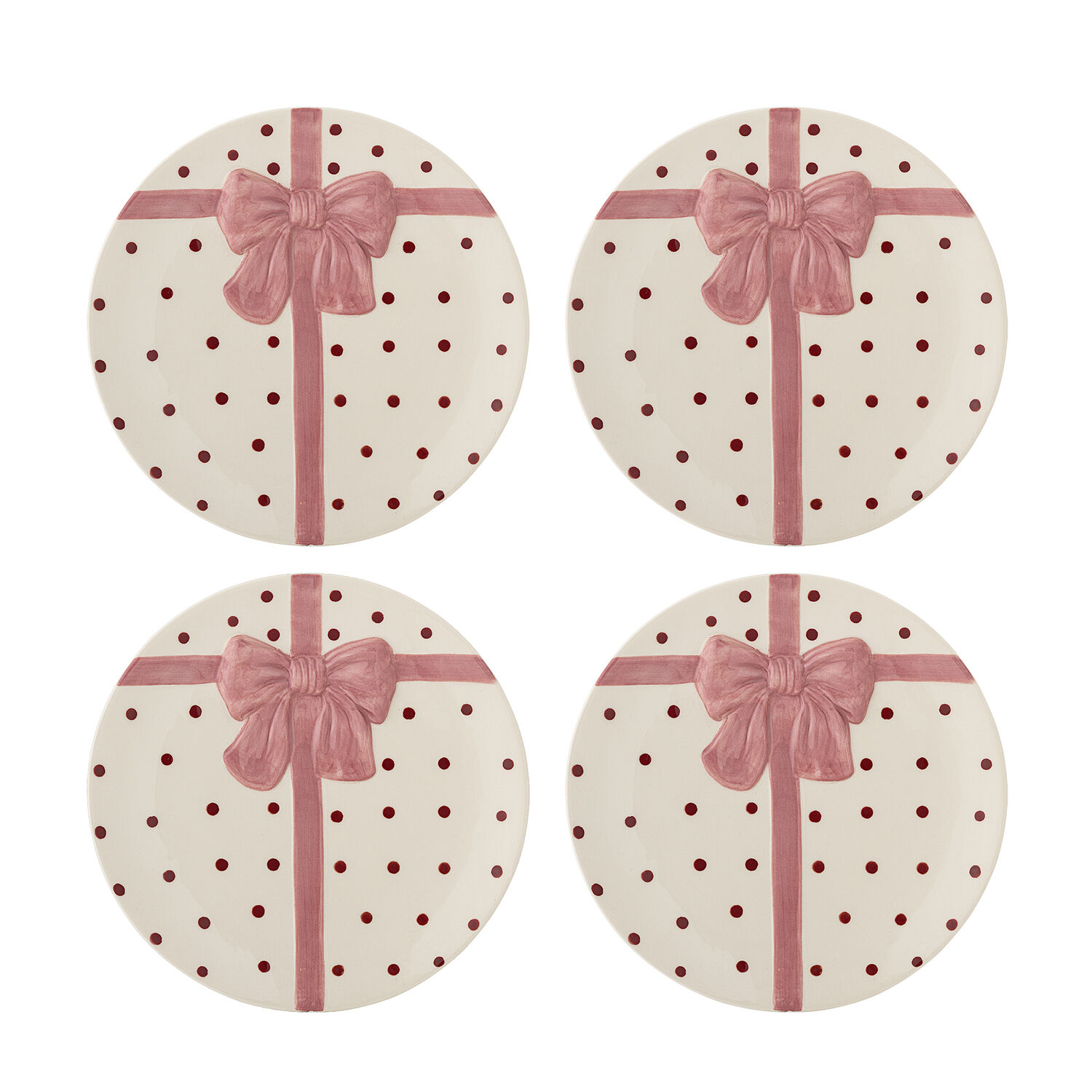 Disse rosa tallerkener fra Bloomingville kombinerer praktisk funktionalitet med håndlavet æstetik. Sættet indeholder fire tallerkener i stentøj, hver med en håndmalet overflade, der viser en dekorativ sløjfe og prikker. Tallerkenerne måler D20,5 x H2 cm og er fødevaregodkendte.