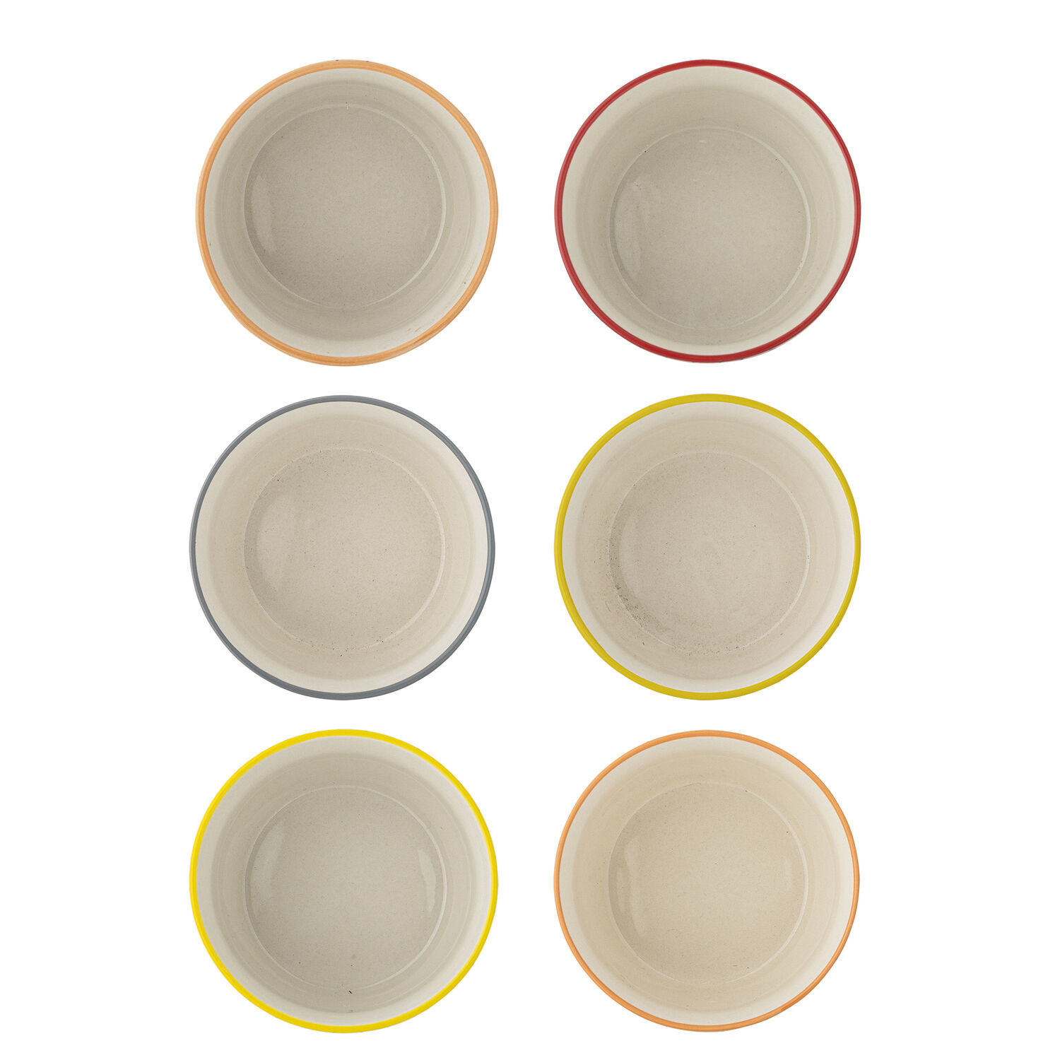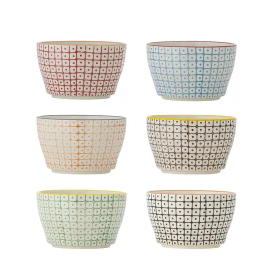 Seks skåle, hver med sit eget gridmønster i forskellige farver. Bloomingville - Carla Skål måler D11 x H6,5 cm og rummer 350 ml, hvilket gør dem velegnede til morgenmad, snacks eller tilbehør ved bordet.