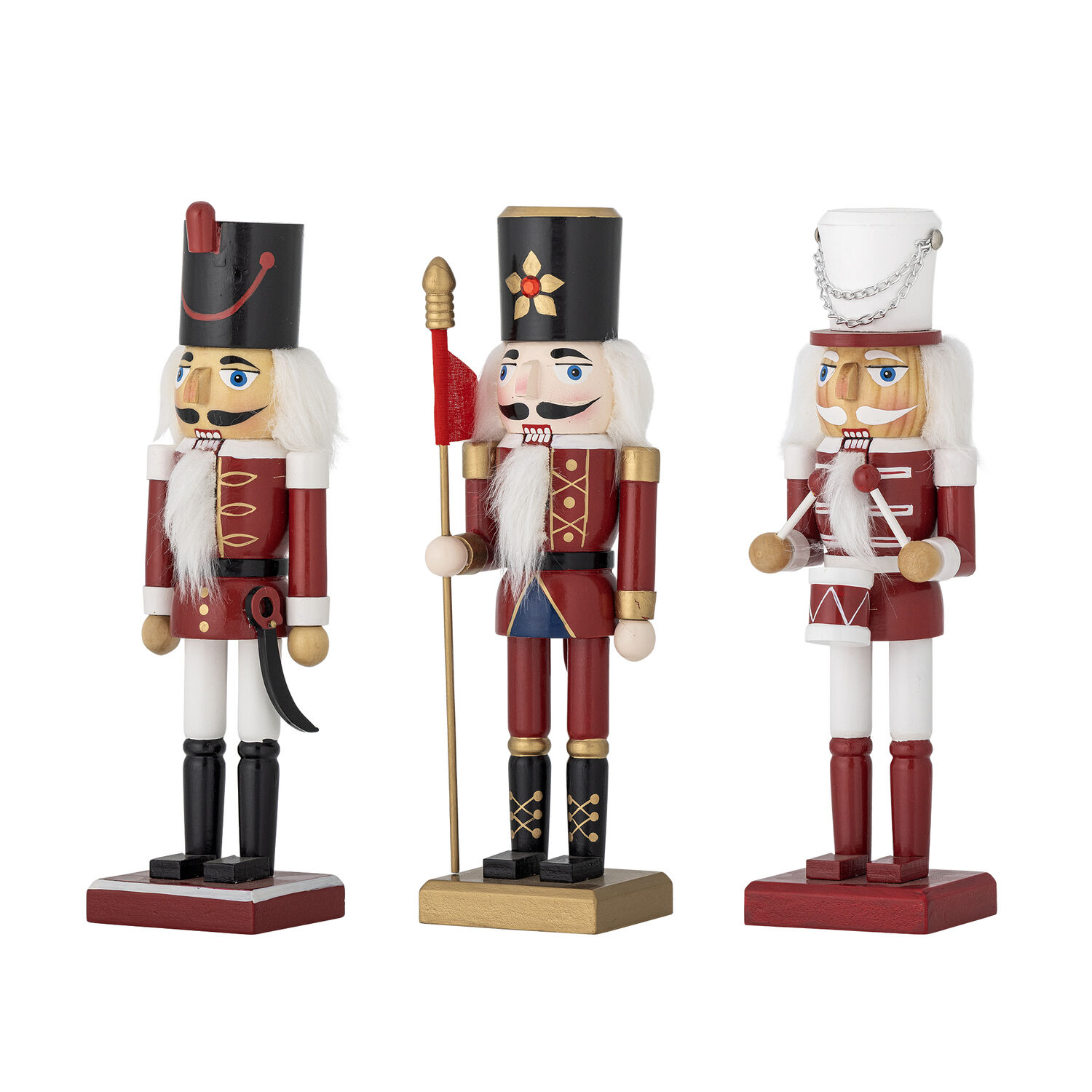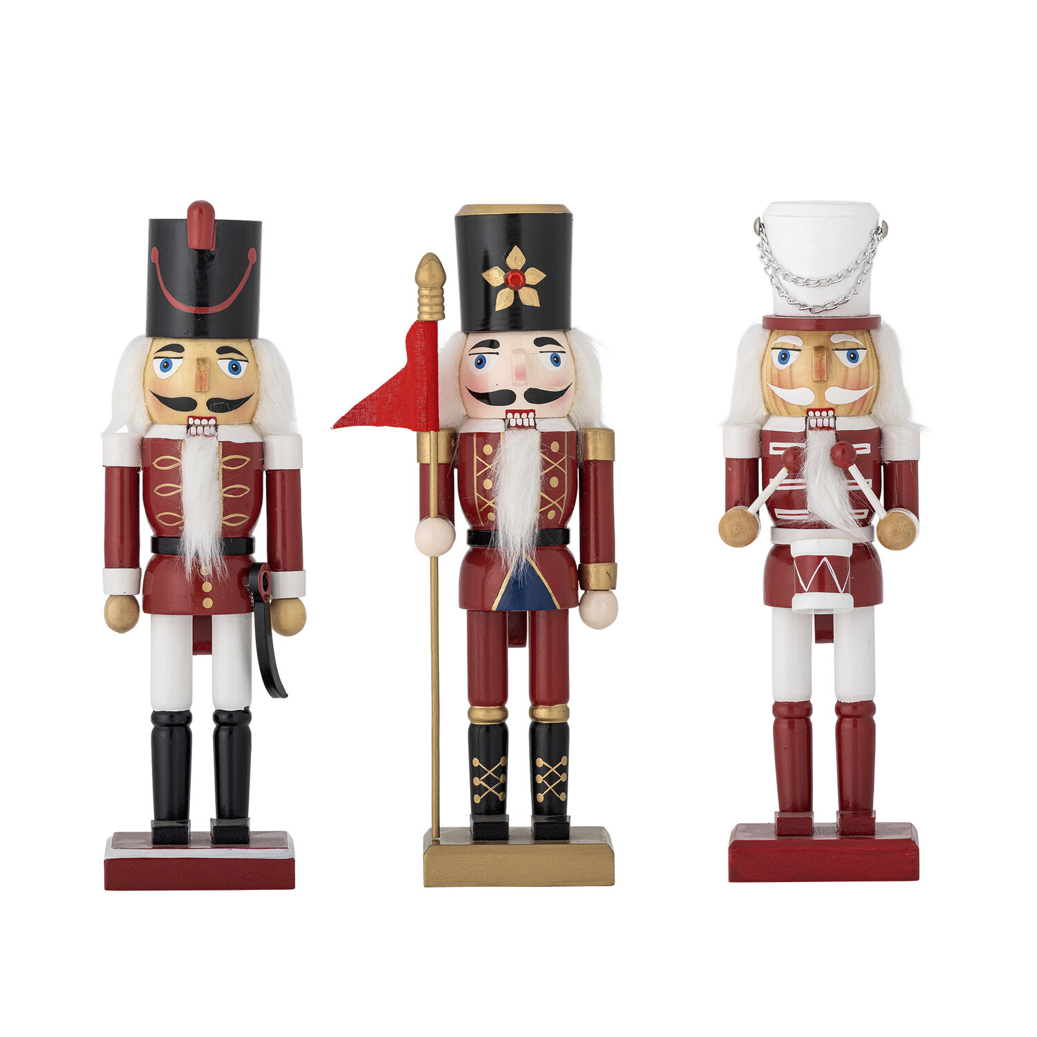 Dette sæt består af tre nøddeknækkerfigurer, hver med håndmalet finish i røde, hvide og sorte farver. Figurerne er lavet af polyester, fyrretræ, krydsfiner og jern, og hver figur har sin egen unikke detalje – et flag, en tromme eller en sabel.