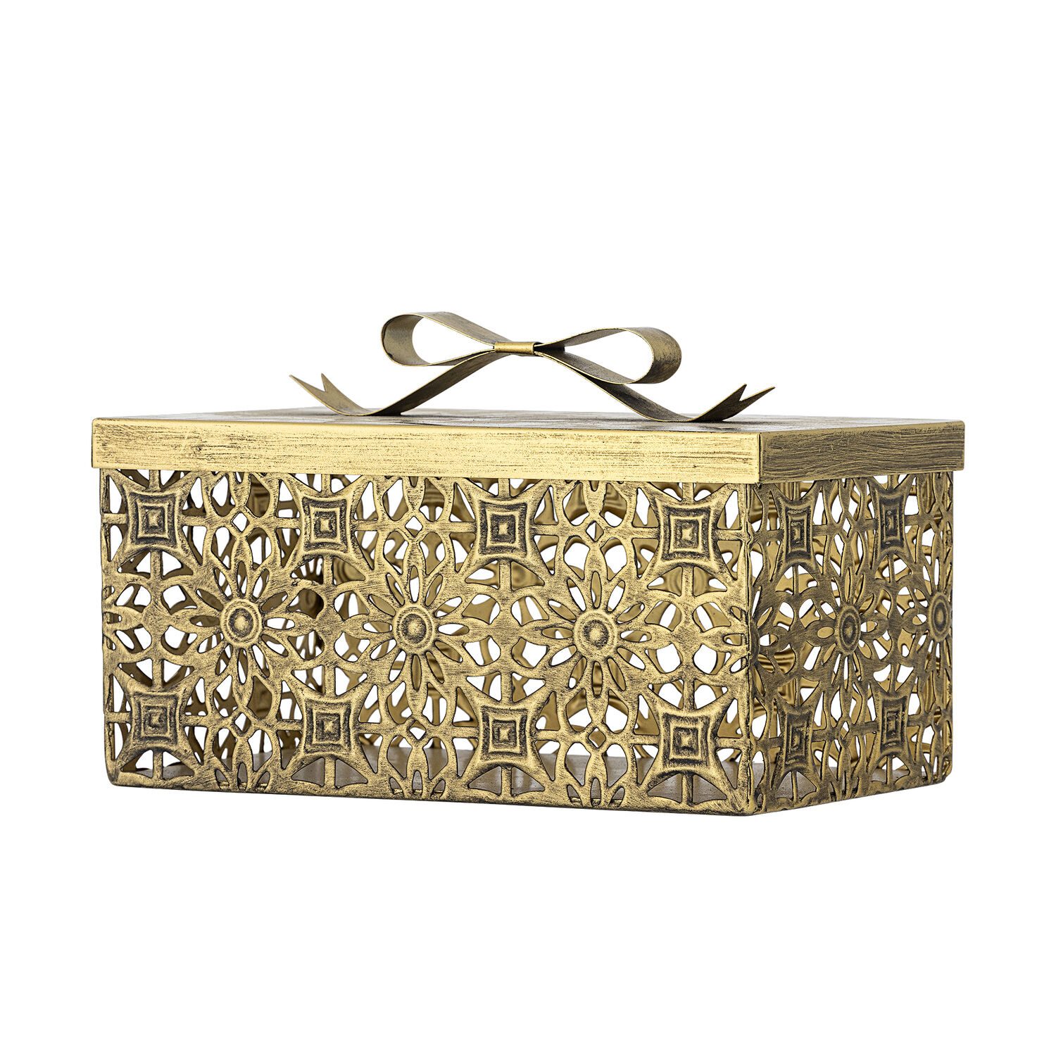 Denne dekorative æske fra Bloomingville kombinerer funktionel opbevaring med håndværksmæssig detaljering. Lavet af 100 % jern med en gylden lakfinish, måler den 25 x 15 x 15 cm, hvilket giver plads til smykker, små accessories eller personlige genstande. Den sløjfeformede hank på låget gør det nemt at åbne og lukke æsken.