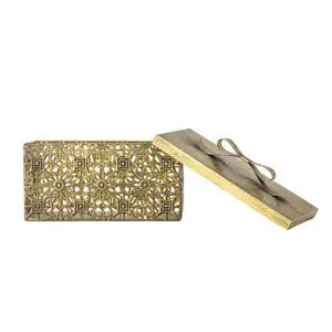 Hvis du søger opbevaring, der ikke skal gemmes væk, er denne æske designet til at stå fremme. Det detaljerede blomstermønster i udskæringen giver en kunstnerisk værdi, der gør æsken til en del af indretningen. Den gyldne farve tilføjer et visuelt element, som passer til rum, hvor æstetik har betydning.