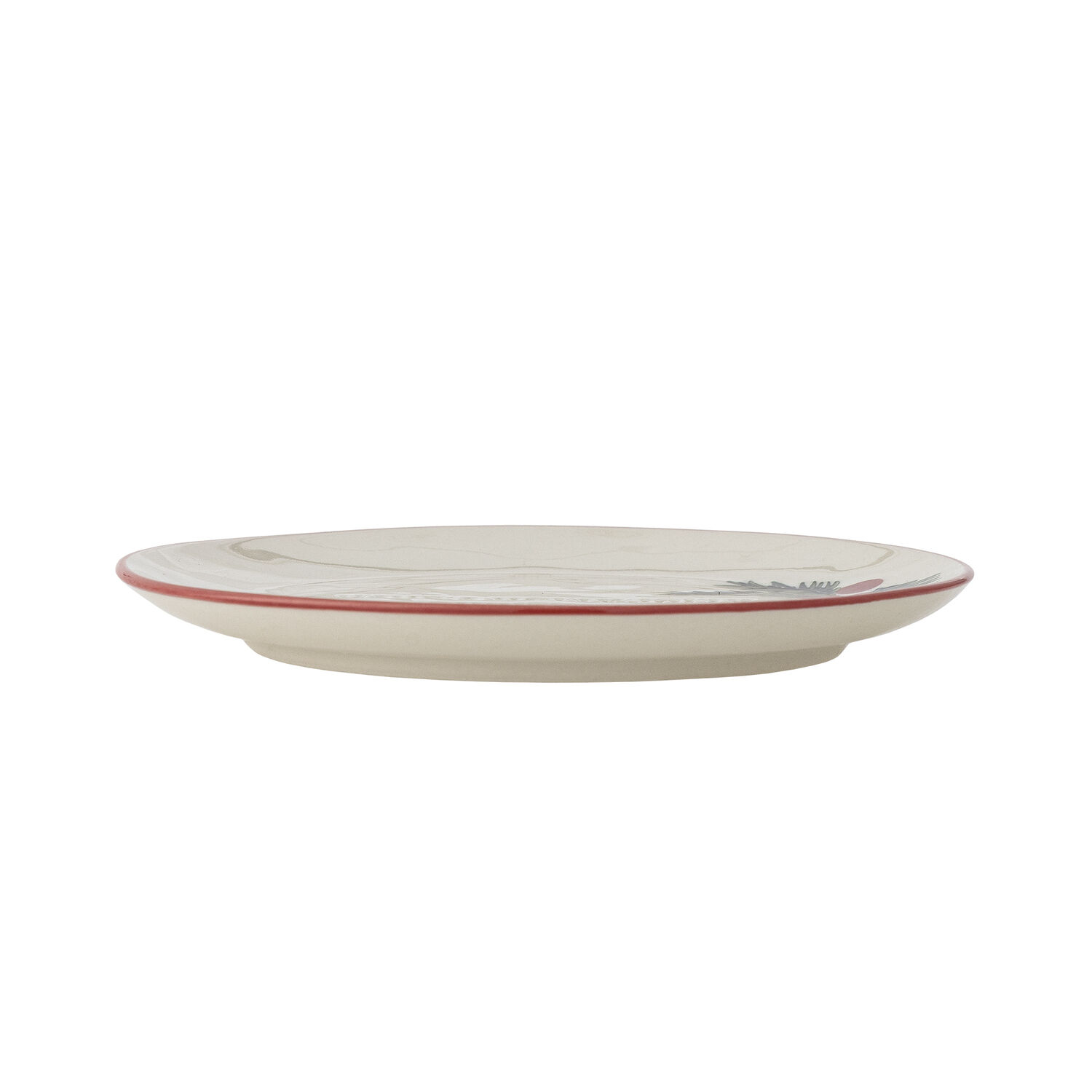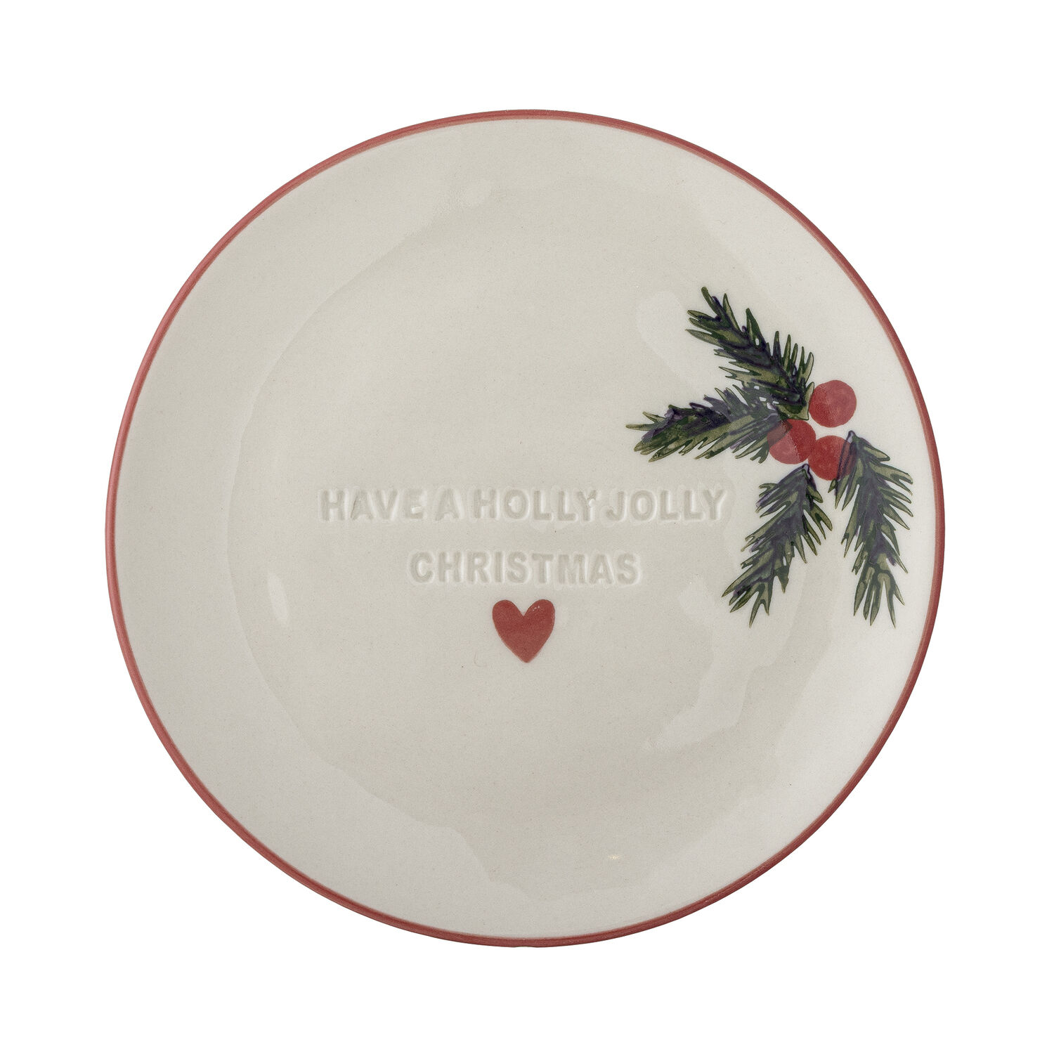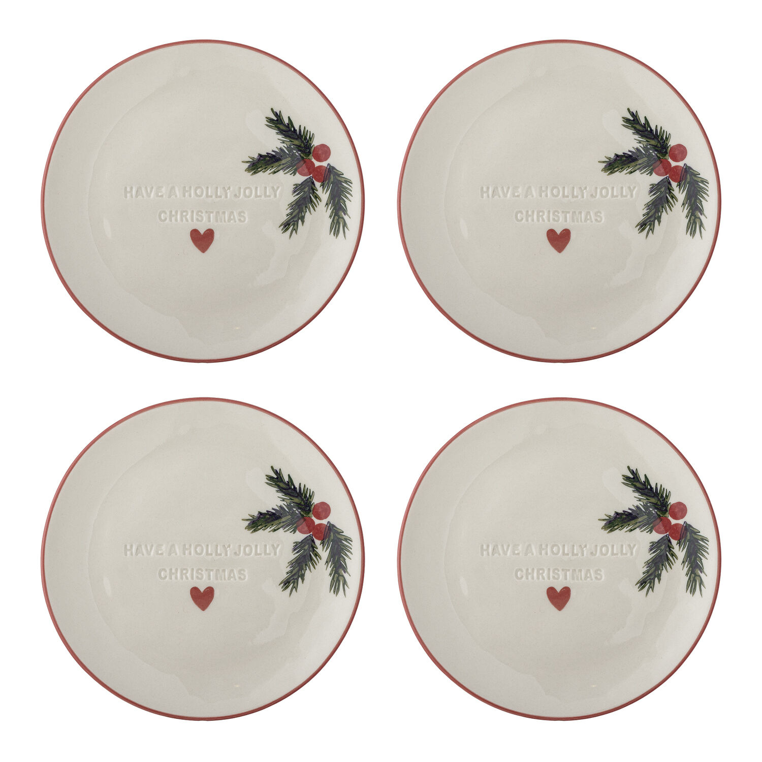 Denne tallerken er lavet af 100 % stentøj, et materiale der er anerkendt for sin holdbarhed og kvalitet. Sættet består af fire tallerkener med en naturlig farve og håndmalet finish, der viser grangrene, røde bær og en rød kant. Hver tallerken måler D16 x H2 cm.