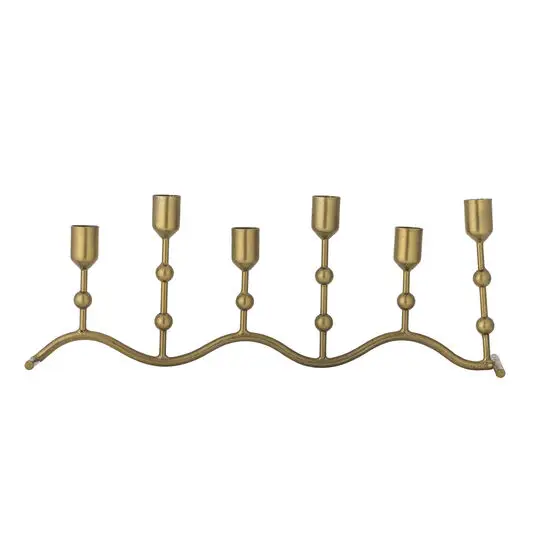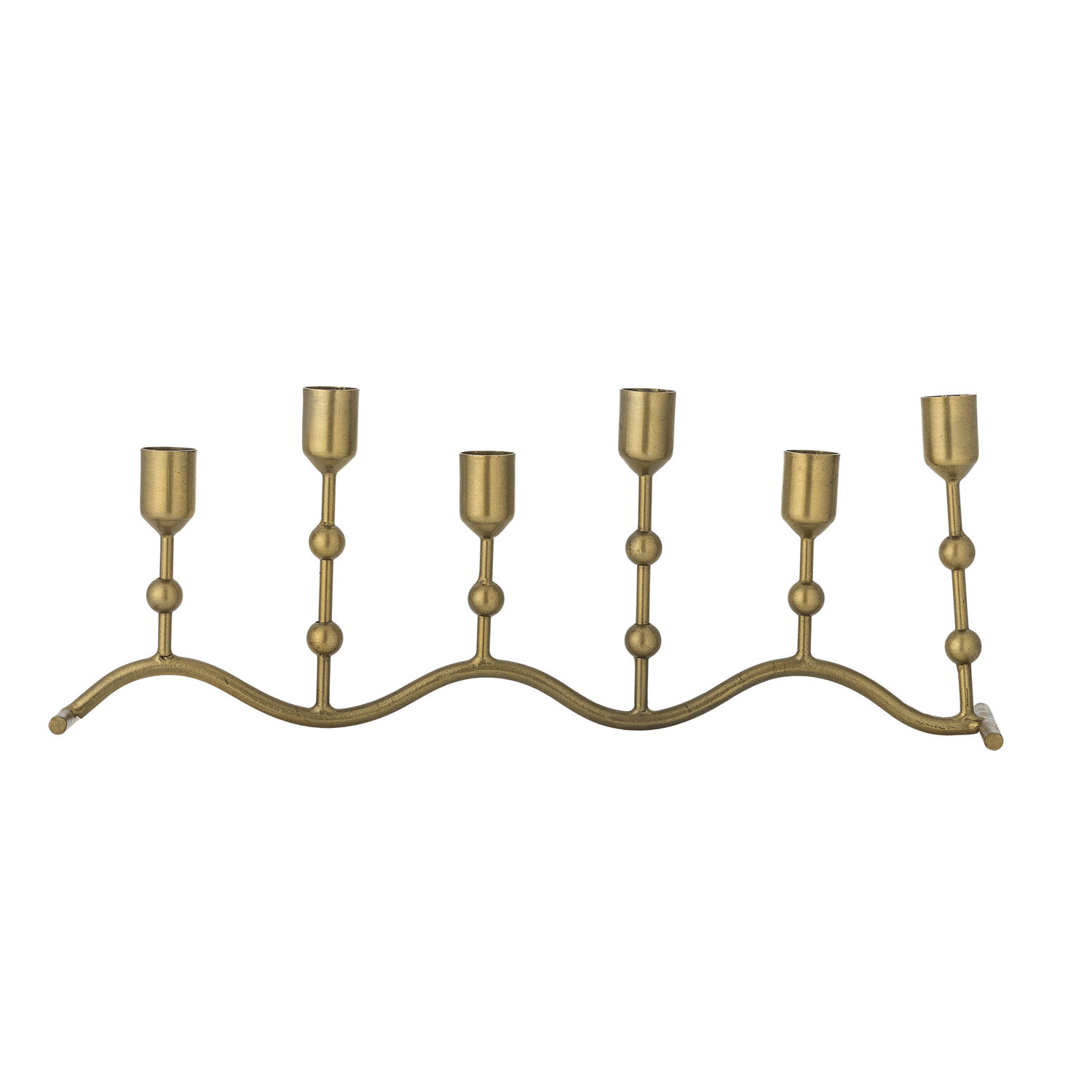 Lysestagen er lavet af 100 % jern, hvilket giver den vægt og stabilitet. Messingfarven passer ind i både klassiske og moderne indretninger. Den bølgede base med sfæriske detaljer på hver stang giver et skulpturelt udtryk, der fungerer, selv når lysene ikke er tændt. Diameteren på Ø 2,2 cm passer til almindelige stearinlys.