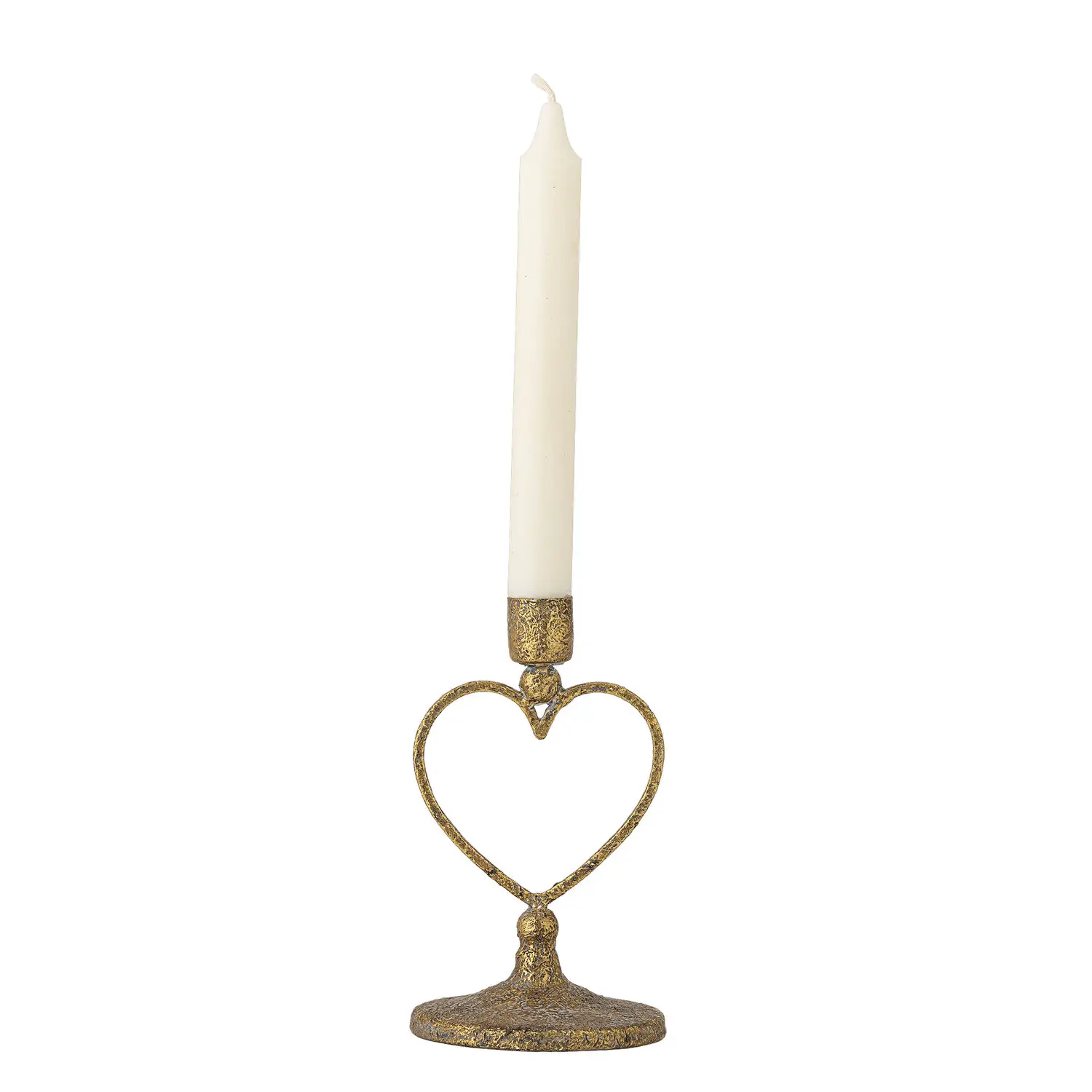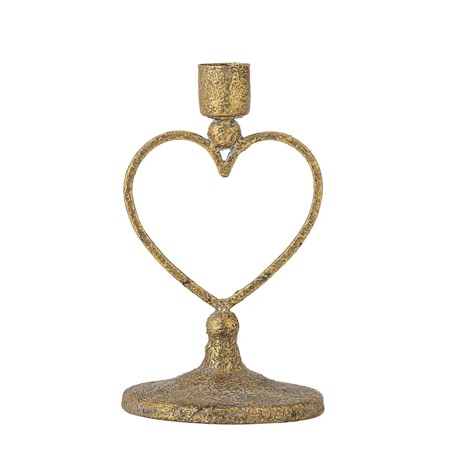 Denne lysestage fra Bloomingville har et hjerteformet design i midten, der gør den til et dekorativt element i dit hjem. Den guldfarvede overflade med struktureret finish giver et stilfuldt touch til din indretning.