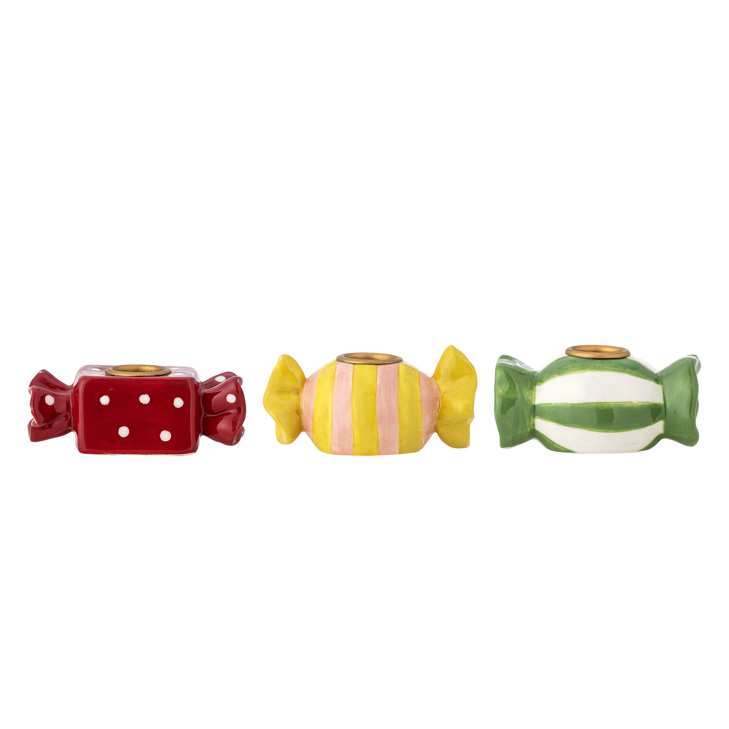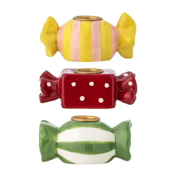 Dette sæt indeholder tre lysestager formet som bolcher, hver med sit eget farvemønster. Du får én med gul og lyserød striber, én rød med hvide prikker og én grøn og hvid stribet. Den multifarvede finish gør dem til et iøjnefaldende element i din indretning, og fordi de er håndmalede, er hver lysestage forskellig.