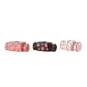 Dette sæt består af tre lysestager i dolomitkeramik, hver formet som indpakkede bolcher med håndmalede mønstre. Den rosa lysestage har cirkelmønstre, mens de to andre varierer i farve og design. Hver lysestage måler L12 x H4 x B4,5 cm med en diameter på Ø 2,2 cm, hvilket passer til standardlys.