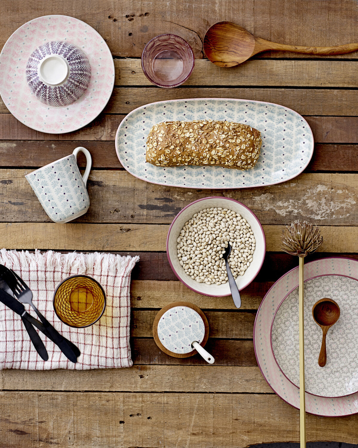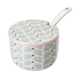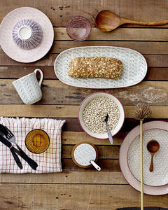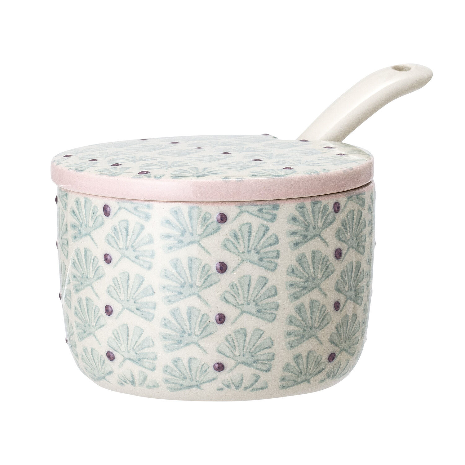 Maya-krukken m/låg & ske fra Bloomingville er perfekt til opbevaring af sukker, salt og andre krydderier på charmerende vis. Lavet af stentøj og håndmalet i et dekorativt blomstermønster, er Maya-krukken forstærket med taktile lilla prikker, der føles rart omkring dets design.