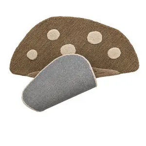 Den brune svampehoved med lyse cirkulære pletter giver tæppet et unikt udtryk, der skiller sig ud fra traditionelle tæpper. Størrelsen på 90 x 85 cm gør det nemt at placere i forskellige rum, og uldmaterialet betyder, at tæppet kan holde til aktivitet uden at miste sin form eller komfort over tid.