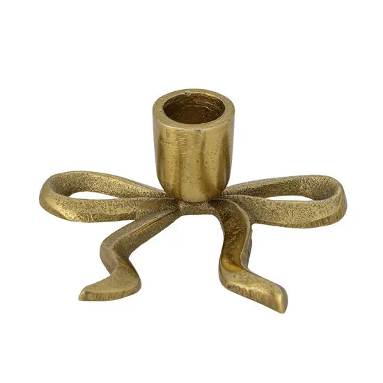 Denne lysestage fra Bloomingville har en gylden finish, der kan tilføje et varmt præg til dit bord eller vindueskarm. Den er fremstillet i 100 % aluminium, hvilket betyder, at den er let at flytte rundt og holder sig pæn over tid uden at ruste. Det sløjfeformede design giver karakteren et skulpturelt udtryk.