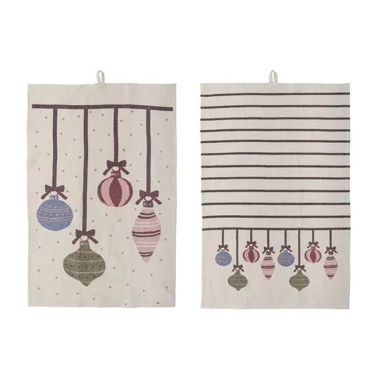 Dette sæt består af to viskestykker i 100 % bomuld med håndtrykte julemønstre. Bomulden er OEKO-TEX®-certificeret, hvilket sikrer, at materialet er testet for skadelige stoffer. Hvert viskestykke måler 71 x 45 cm og har en praktisk løkke til ophængning, så de er nemme at have ved hånden i køkkenet.