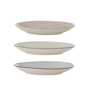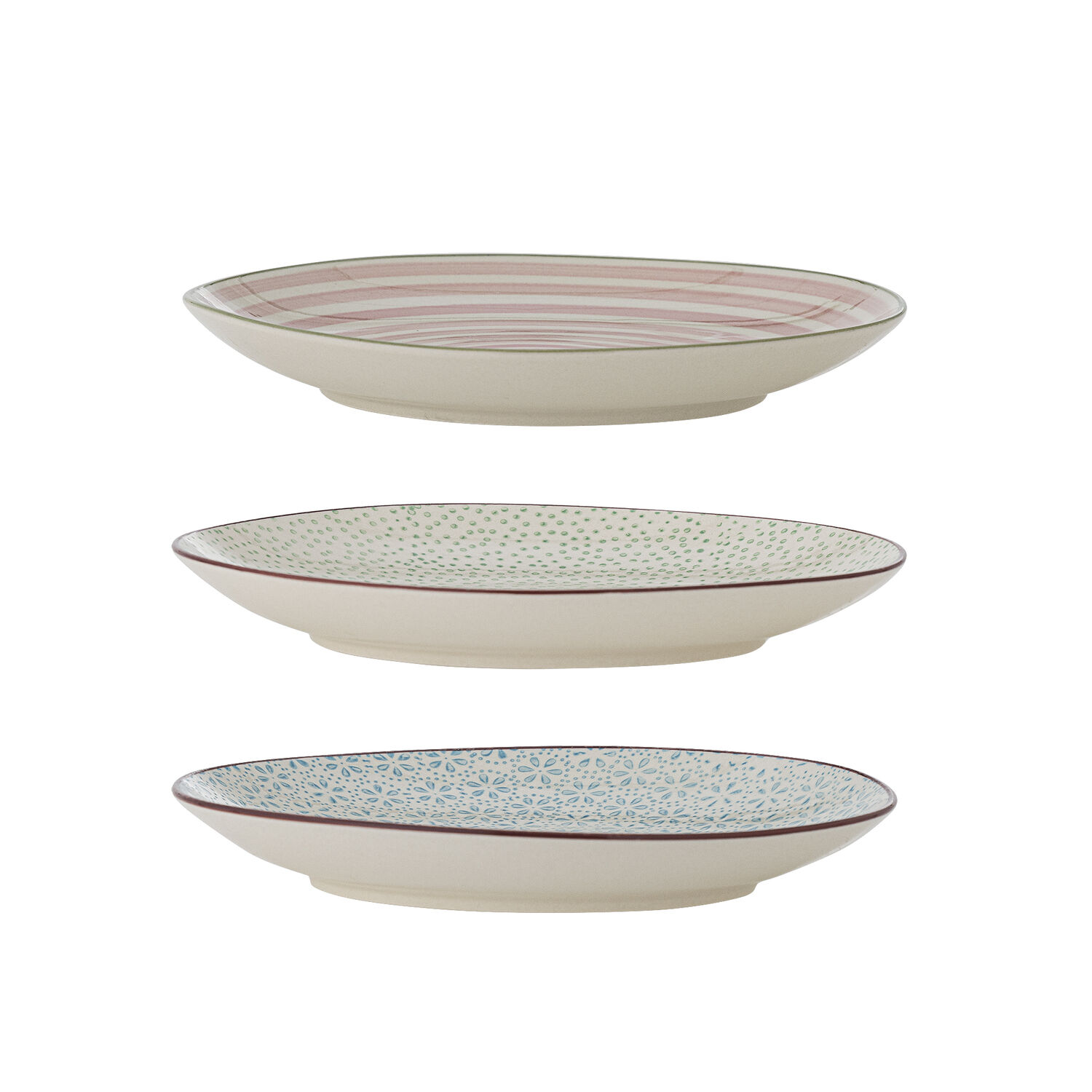 Dette sæt fra Bloomingville består af tre tallerkener i stentøj, hver med sit eget håndmalede mønster – cirkulært, geometrisk og prikket. Tallerkenerne måler D20 x H2,5 cm og er fremstillet af 100% stentøj med klistermærketryk og håndmalede detaljer, der gør hver tallerken særpræget. Den let forhøjede kant hjælper med at holde på maden.