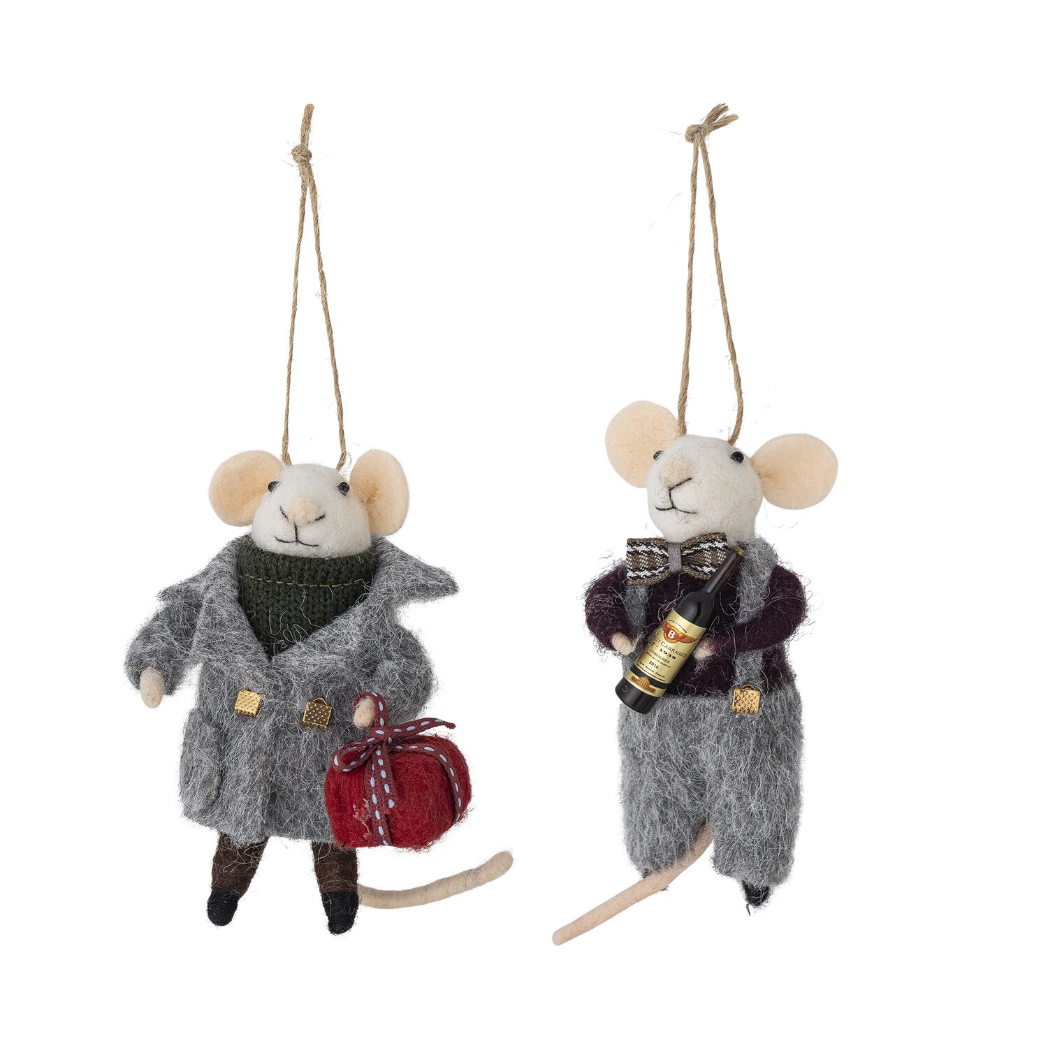 Dette sæt indeholder to håndlavede museornamenter, der hver måler 8 cm i længde, 11 cm i højde og 7 cm i bredde. Musene er klædt i gråt tøj lavet af polyester og uld, hvilket giver en blød tekstur. Den ene holder en lille pakke, mens den anden bærer flasker - ideelt til at tilføje et legende præg til din juledekoration.