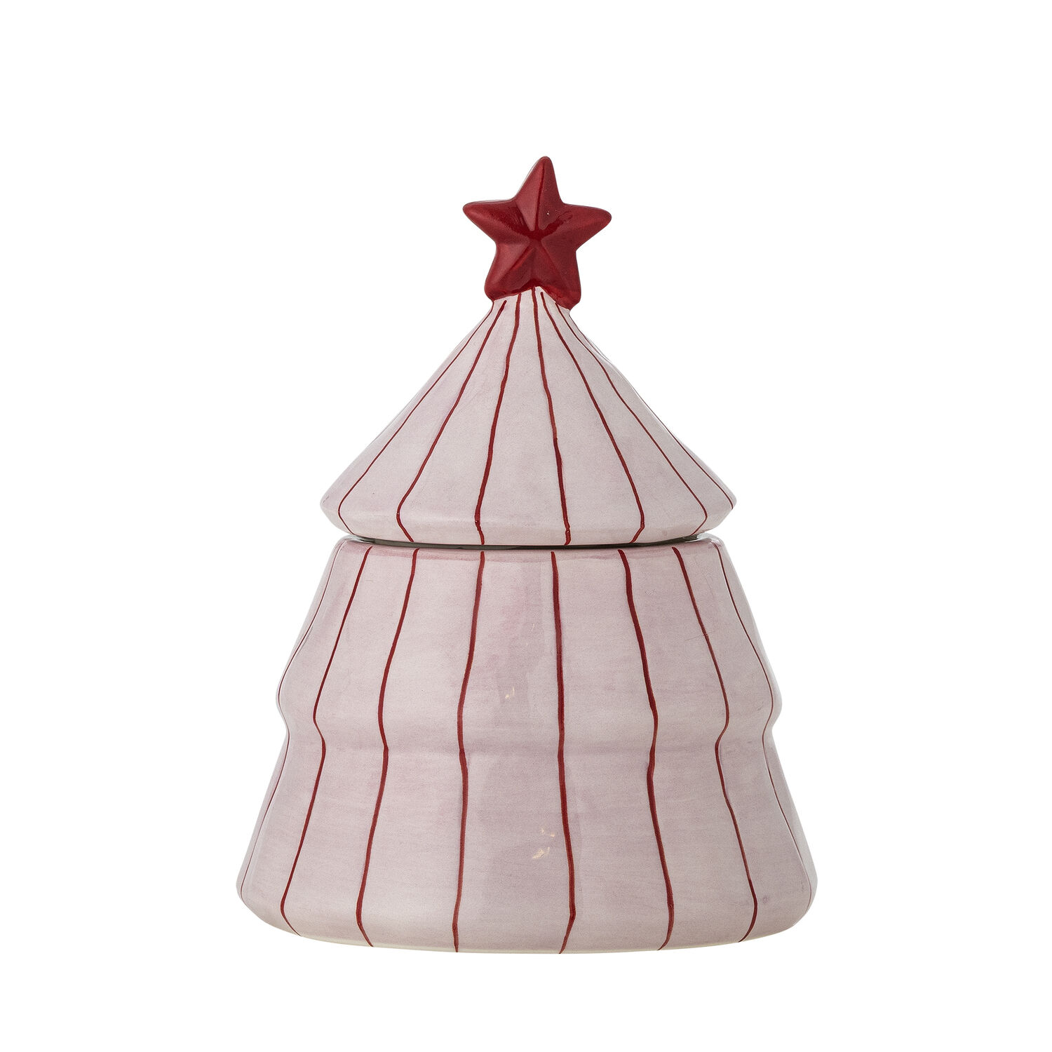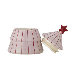 Denne krukke fra Bloomingville er fremstillet af 100 % stentøj og måler 12 cm i diameter og 16 cm i højde. Den rosa krukke har et håndmalet finish med røde lodrette linjer og et kegleformet låg med en rød stjerne på toppen. Produktet er fødevaregodkendt, så du kan trygt opbevare dine madvarer i den.
