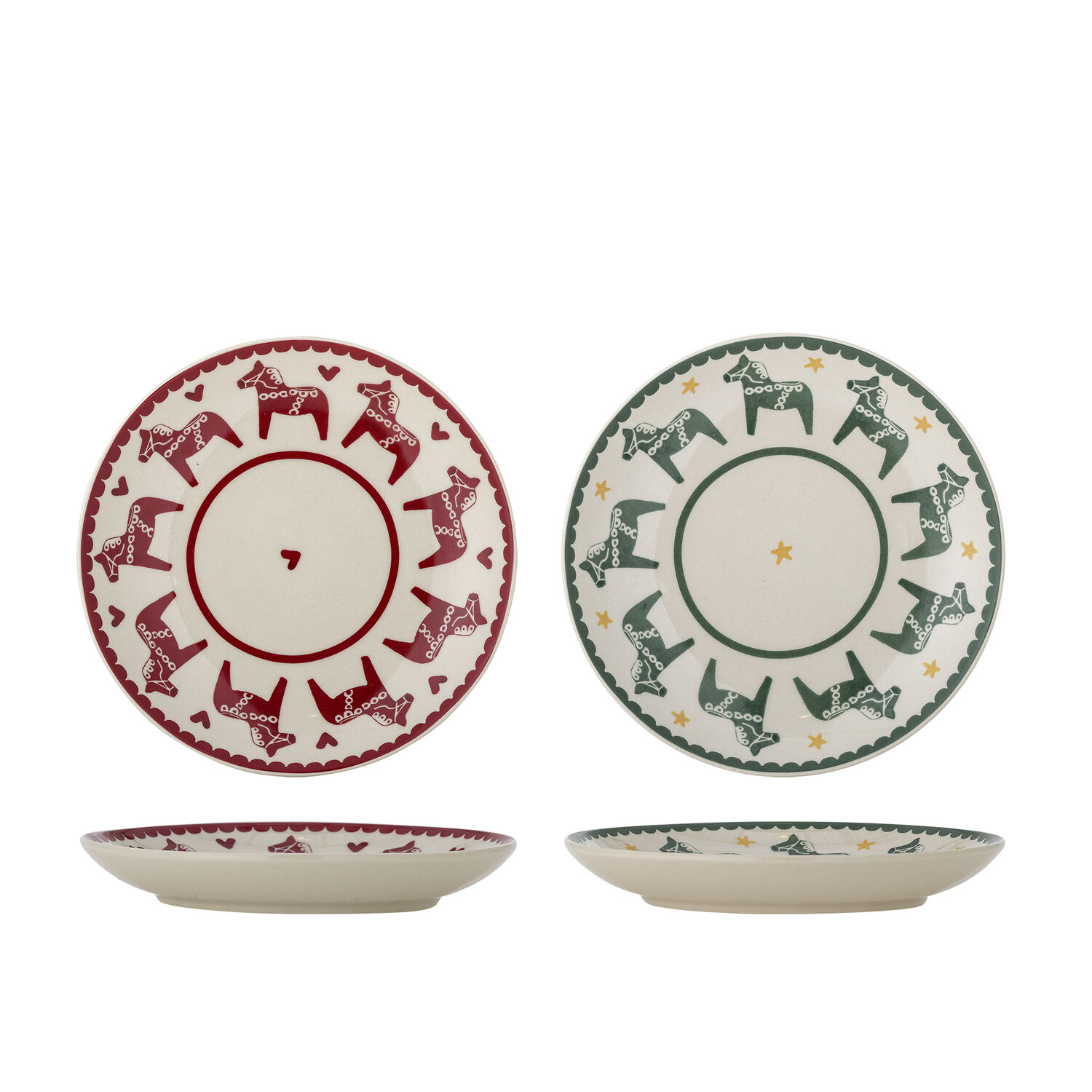 Dette sæt indeholder to tallerkener i multifarvet stentøj med stiliserede hestemotiver – en med rød dekoration og en med grøn. Hver tallerken måler D16 x H3 cm og har en glasurfinish, der beskytter overfladen mod pletter. Tallerkenerne er fødevaregodkendte og lavet af 100 % stentøj.