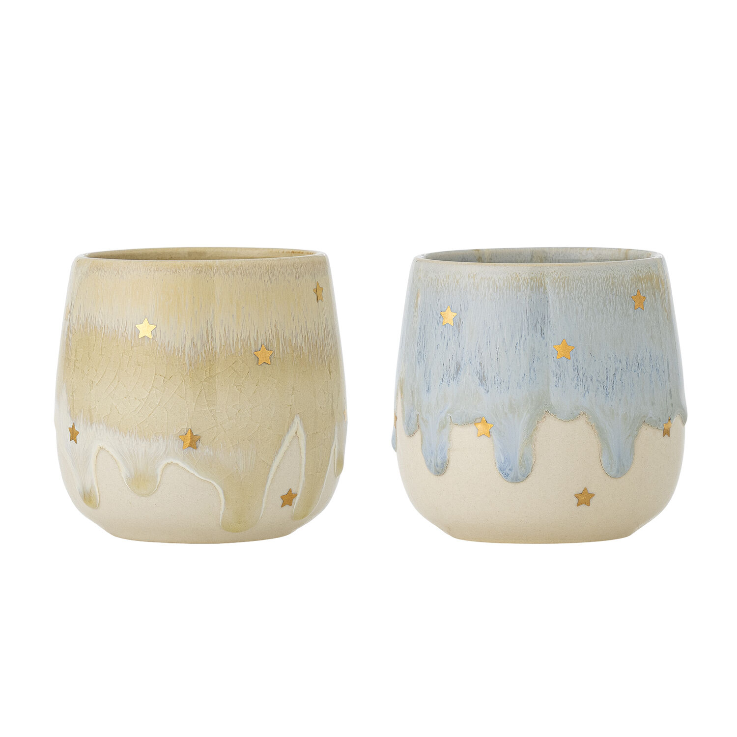 Stentøjets robuste karakter betyder, at kopperne holder længe, selv ved regelmæssig brug. Det multifarvede design med dryppende glasur og stjernedetaljer tilføjer et personligt præg til dit køkken eller spisebord. Med to kopper i sættet har du altid en ekstra til gæster eller til forskellige drikkevarer i løbet af dagen.