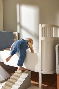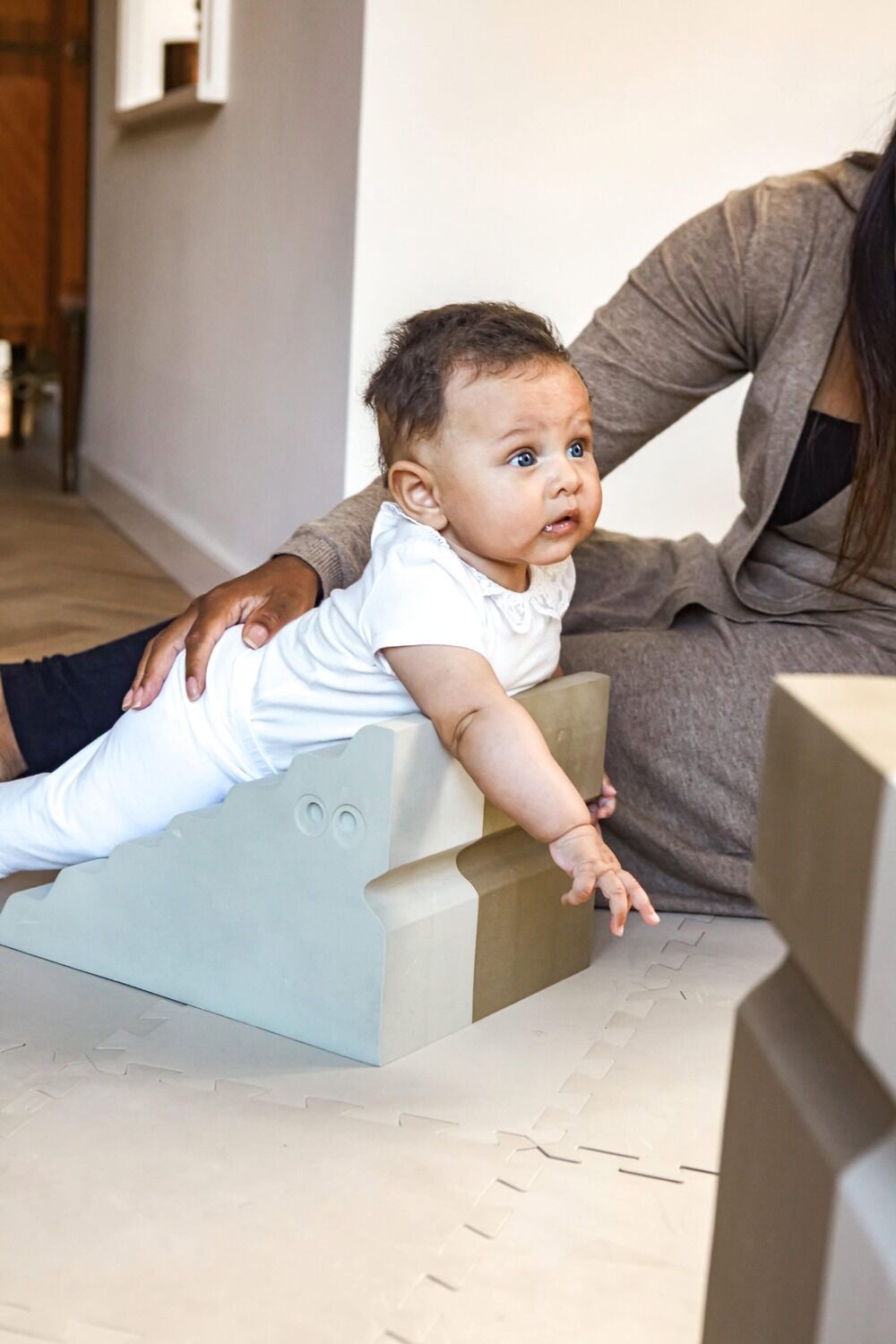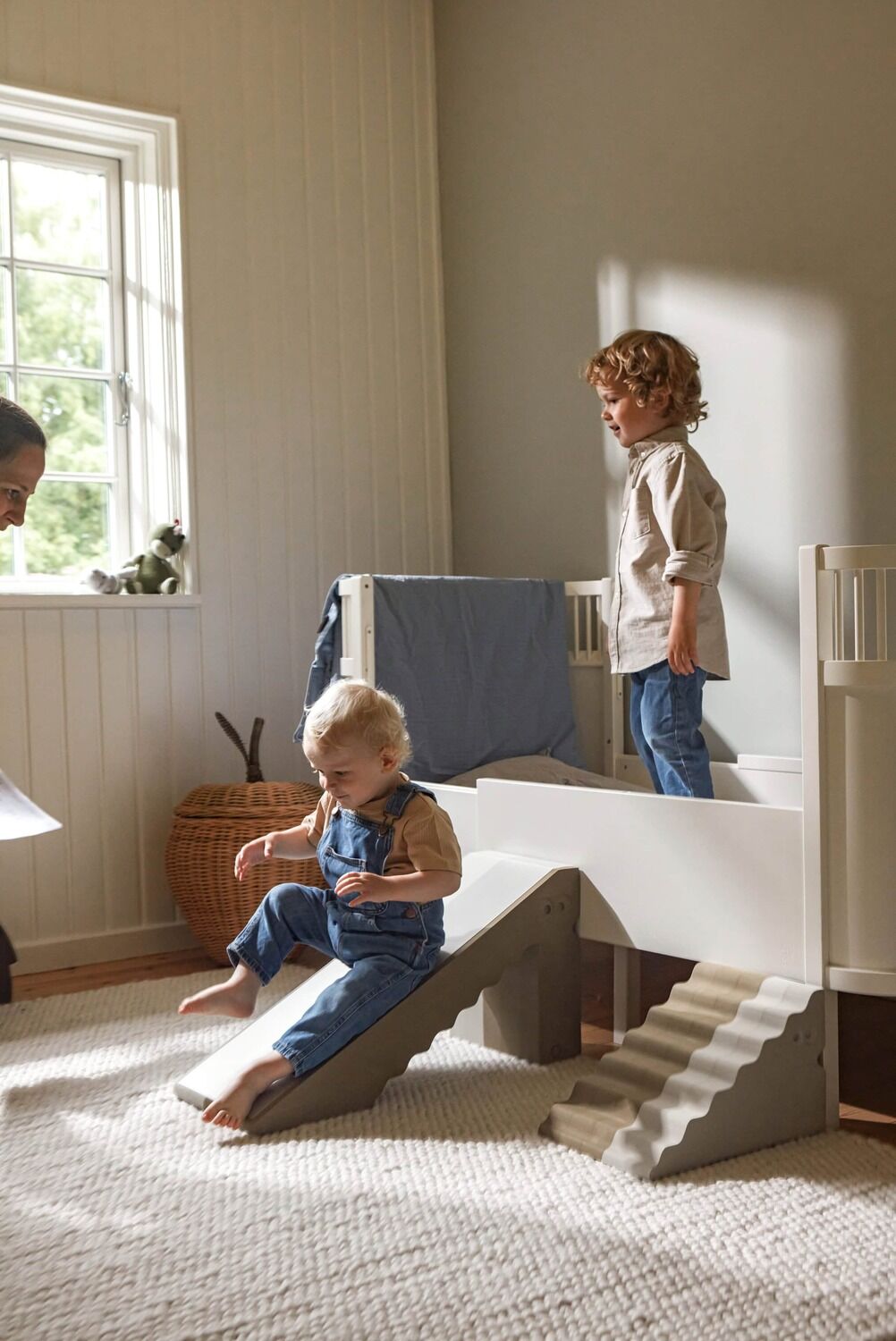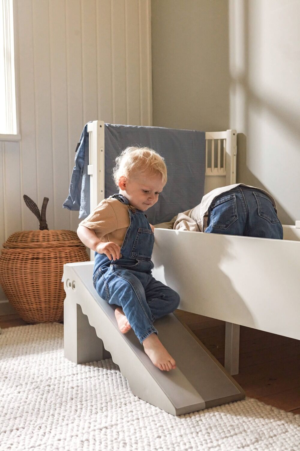 Dino fra bObles er et multifunktionelt legemøbel, der fungerer som rutsjebane, klatrestativ og skammel. Den sandgrå nuance passer ind i de fleste hjem, og den bølgede trappeform inviterer til aktiv leg og motorisk udvikling for børn.