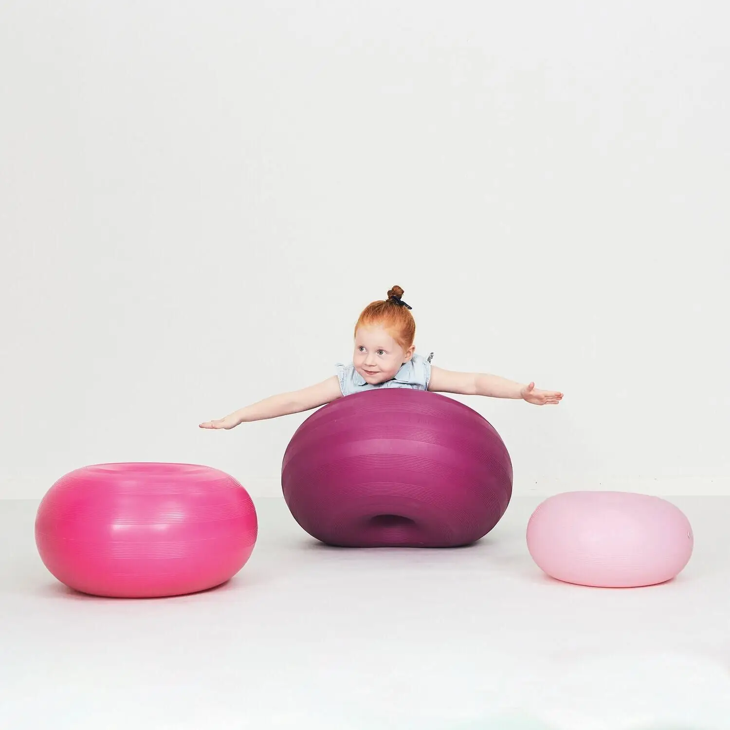Denne donutformede legegenstand i mørk pink er lavet af elastisk gummi og fås i tre størrelser. EVA-skumknappen i midten kan fjernes, hvilket gør det muligt at bruge Donut som en gynge. Den står stabilt ved at danne et vakuum mod underlaget.