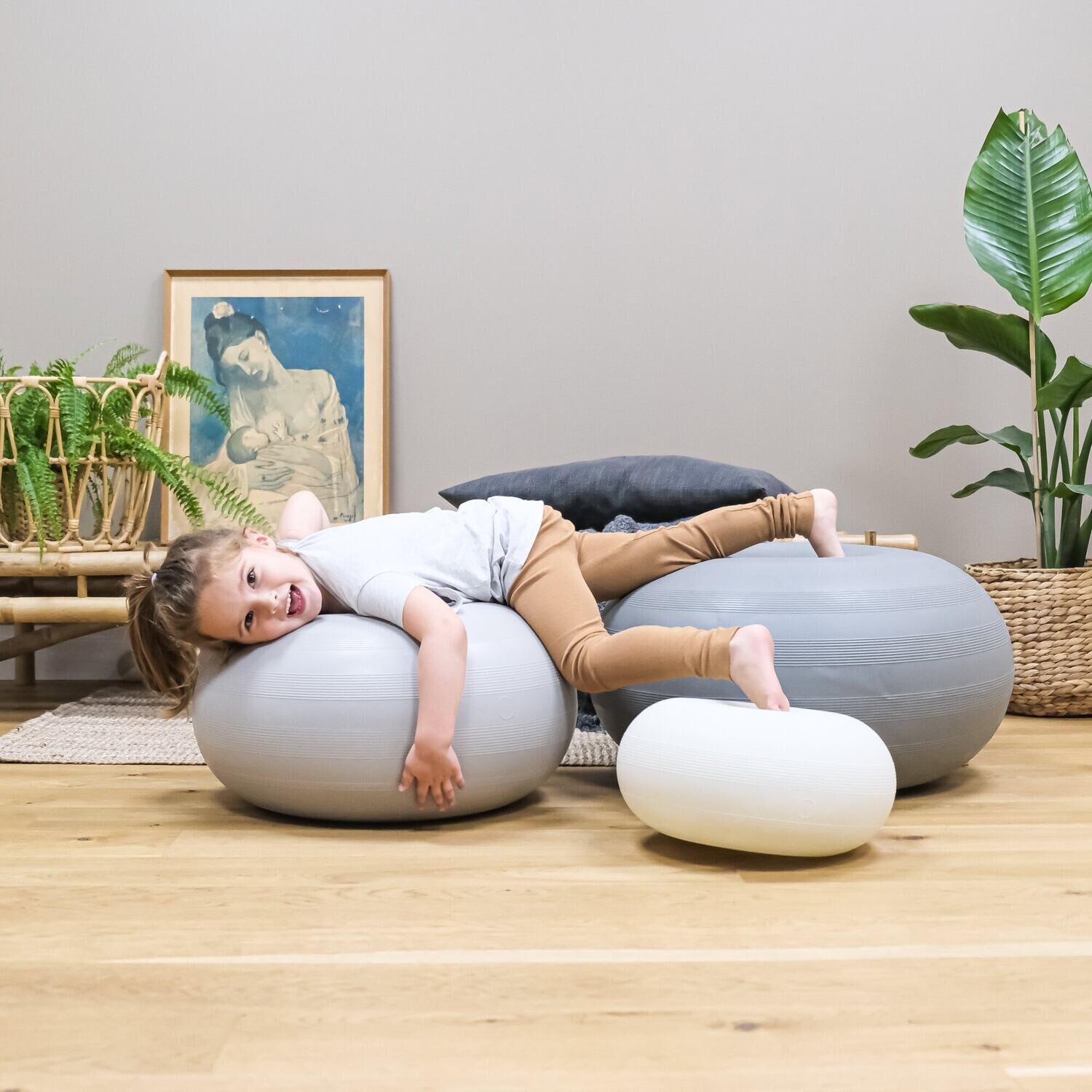 Ved at fjerne EVA-skumknappen i midten får du en gynge, som tilføjer en ny dimension til legen. Det vakuum, som donuten danner mod underlaget, betyder, at den står stabilt under brug. Dette giver dig tryghed, når dit barn leger aktivt og udvikler motorik gennem bevægelse.