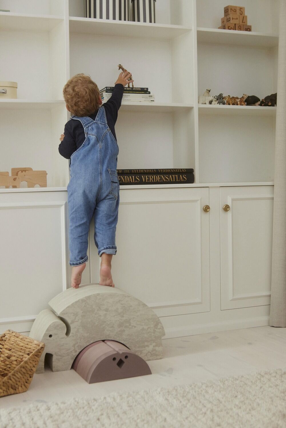 bObles Elefant er et elsket tumlemøbel, der kombinerer leg, motorisk udvikling og praktisk funktionalitet i én form. Den hjælper børn op i højderne, giver sommerfugle i maven og fungerer samtidig som stol, bord og skammel i hverdagen. Den er ideel til rutiner som håndvask, tandbørstning og sengetid - og samtidig et motorisk redskab, der udvikler barnets balance og koordination gennem leg. Fra baby til stort barn er Elefanten et alsidigt tumlemøbel. Den mindste kan træne nakke og ryg ved at ligge hen over den buede ryg, og når Kylling lægges i maven på Elefanten, bliver den til en sjov og stimulerende vippe for baby, der styrker vestibulærsansen og skaber nærvær mellem barn og forælder. Tumlingen kan begynde at vippe siddende, og som modet vokser, også stående. Når barnet skal lære at gå, er Elefanten et trygt og stabilt sted at rejse sig op - EVA-skummet er skridsikkert og blødt mod både fødder og gulv. bObles Elefant er let at transportere fra rum til rum, og designet er gennemtænkt, så det passer ind både på børneværelset og i stuen. Den kan indgå i tumlebaner, bruges som siddemøbel ved spisebordet eller som skammel til de mindste, der gerne vil hjælpe til i køkkenet. Uanset hvordan den bruges, inviterer den til leg, bevægelse og motorisk udvikling - og holder til det hele. Mål: H 31 x L 55 x B 21 cm