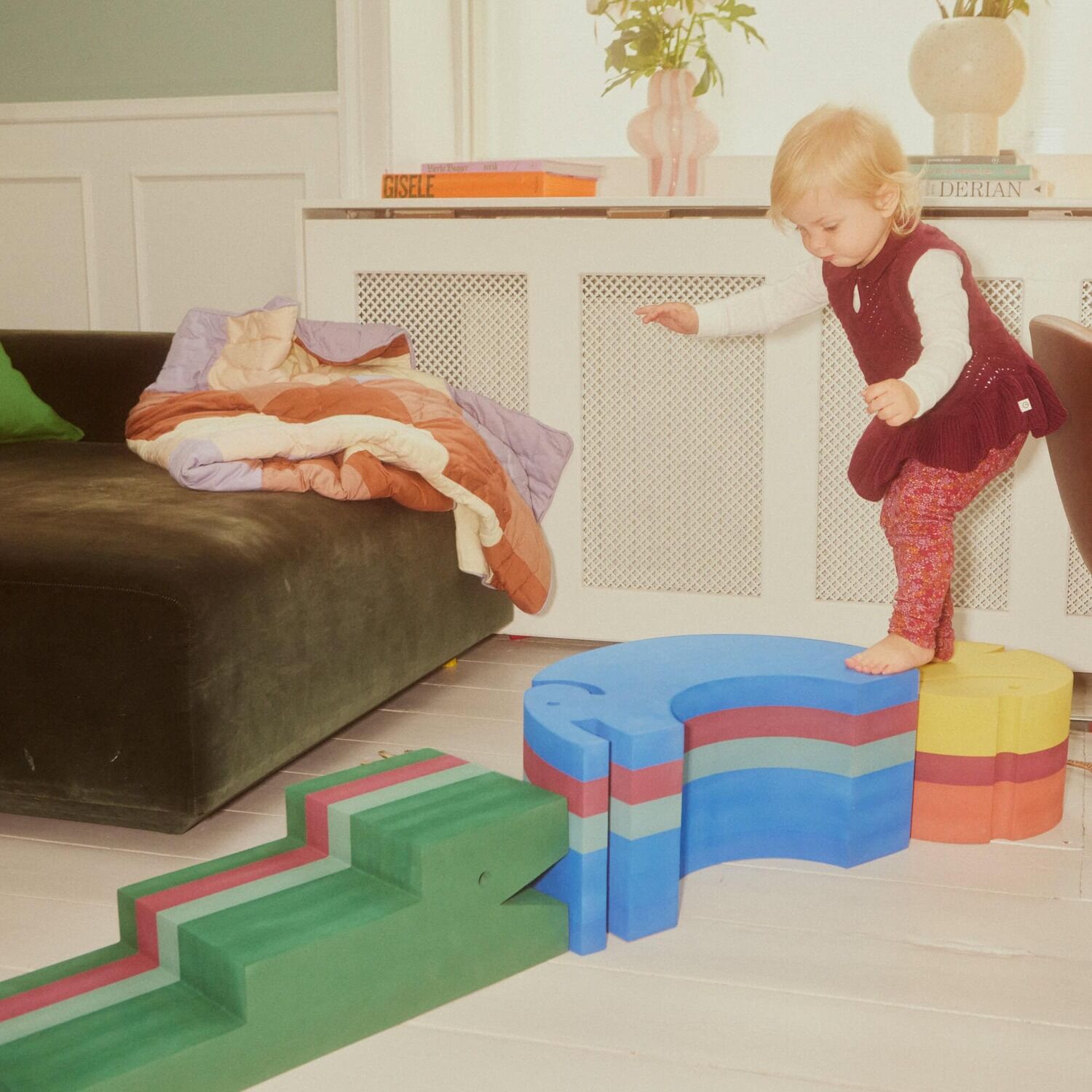 bObles Elefant er et elsket tumlemøbel, der kombinerer leg, motorisk udvikling og praktisk funktionalitet i én form. Den hjælper børn op i højderne, giver sommerfugle i maven og fungerer samtidig som stol, bord og skammel i hverdagen. Den er ideel til rutiner som håndvask, tandbørstning og sengetid - og samtidig et motorisk redskab, der udvikler barnets balance og koordination gennem leg. Fra baby til stort barn er Elefanten et alsidigt tumlemøbel. Den mindste kan træne nakke og ryg ved at ligge hen over den buede ryg, og når Kylling lægges i maven på Elefanten, bliver den til en sjov og stimulerende vippe for baby, der styrker vestibulærsansen og skaber nærvær mellem barn og forælder. Tumlingen kan begynde at vippe siddende, og som modet vokser, også stående. Når barnet skal lære at gå, er Elefanten et trygt og stabilt sted at rejse sig op - EVA-skummet er skridsikkert og blødt mod både fødder og gulv. bObles Elefant er let at transportere fra rum til rum, og designet er gennemtænkt, så det passer ind både på børneværelset og i stuen. Den kan indgå i tumlebaner, bruges som siddemøbel ved spisebordet eller som skammel til de mindste, der gerne vil hjælpe til i køkkenet. Uanset hvordan den bruges, inviterer den til leg, bevægelse og motorisk udvikling - og holder til det hele. Mål: H 31 x L 55 x B 21 cm