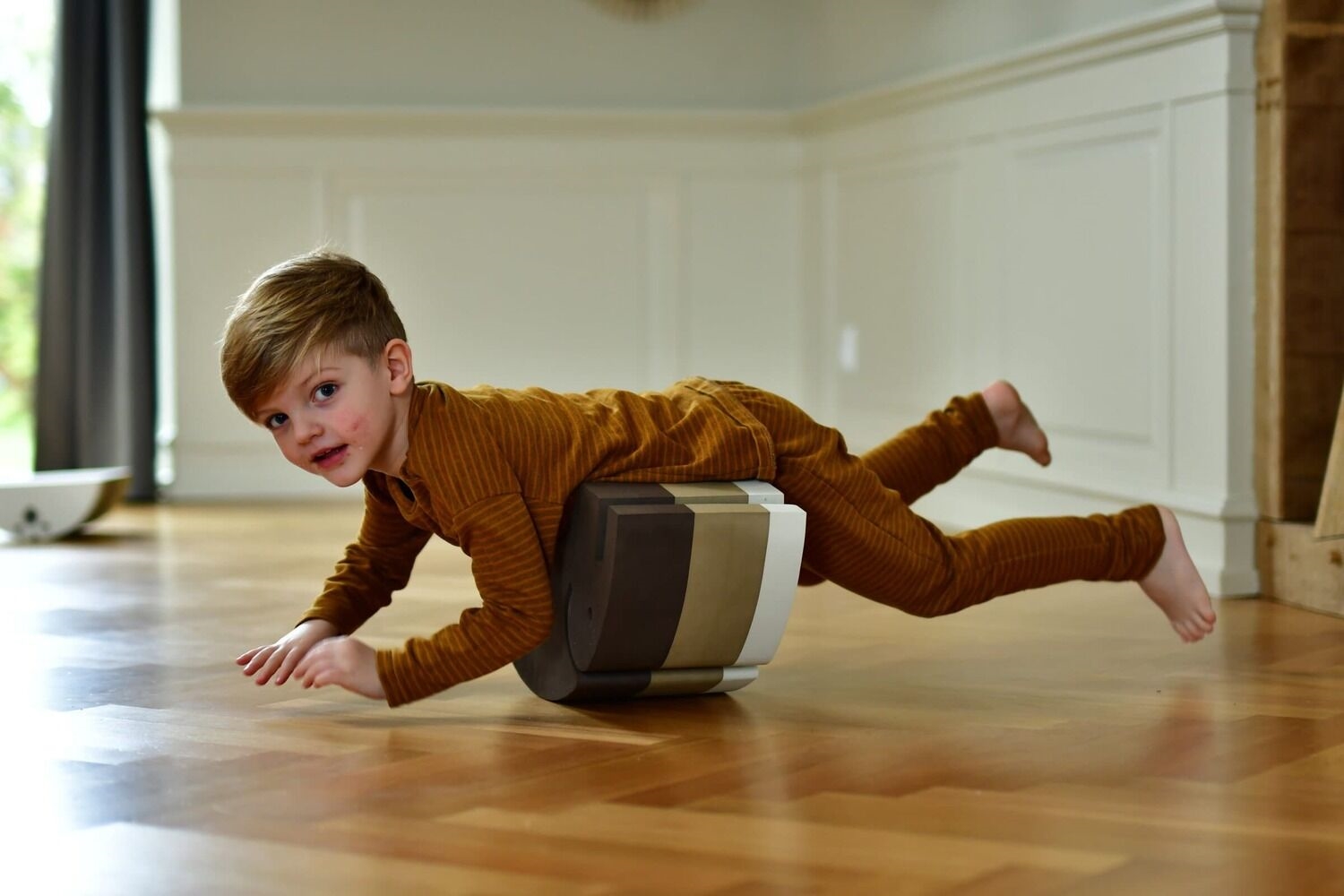 bObles Elephant M er det perfekte tumlemøbel til børn, der er klar til at udfordre motorikken i børnehøjde. Den er mindre end Elephant L og derfor lettere for barnet selv at håndtere. Det gør den ideel til de første balancetrin, vipper og lege med fuld bevægelse. Babyen kan ligge hen over Elefantens runding og styrke nakkemusklerne eller placeres i buen, når Elefanten vendes om, og få stimuleret ryg og balancesans gennem vuggende bevægelser. Når barnet bliver ældre, er Elephant M nem at rejse sig op ad og fungerer som både stol, skammel og vippe i dagligdagen. Den skridsikre overflade i blødt EVA-skum gør den tryg at bruge og nem at flytte rundt på, selv for små hænder og fødder. Uanset om der skal børstes tænder, bages boller eller leges tumlebane, passer Elephant M naturligt ind i hele hjemmet. Den ikoniske form er ikke kun funktionel, men også dekorativ i indretningen. Mål: H 21 x L 37 x B 16 cm Da alle vores tumlemøbler er håndlavede, kan der forekomme mindre variationer i størrelsen.