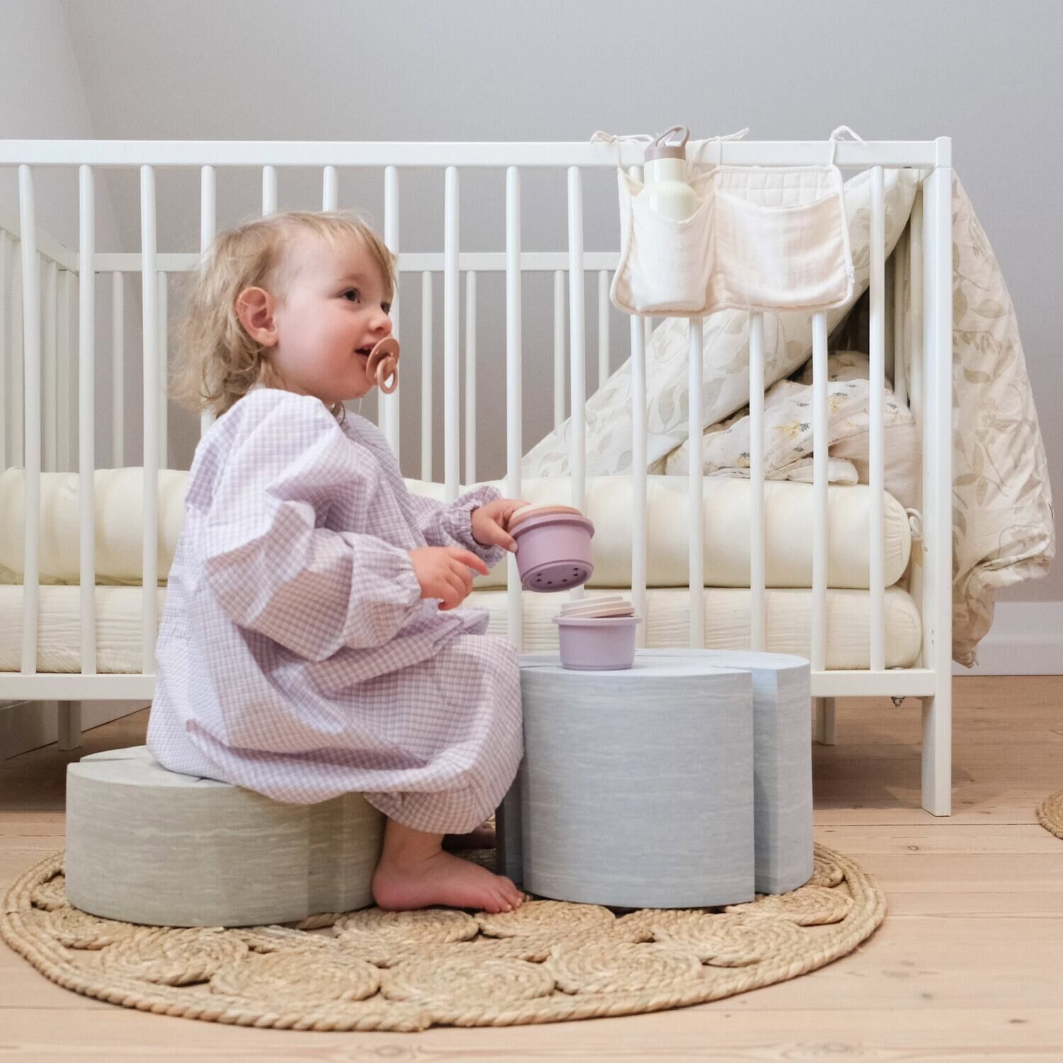 Fisk L Mist kan bruges overalt i hjemmet – i børneværelset, stuen eller entréen. Den runde, cylindriske form med udskæringer, der ligner en fiskemund og finner, gør den visuelt interessant uden at tage for meget plads. Multifunktionaliteten betyder, at den vokser med barnets behov.