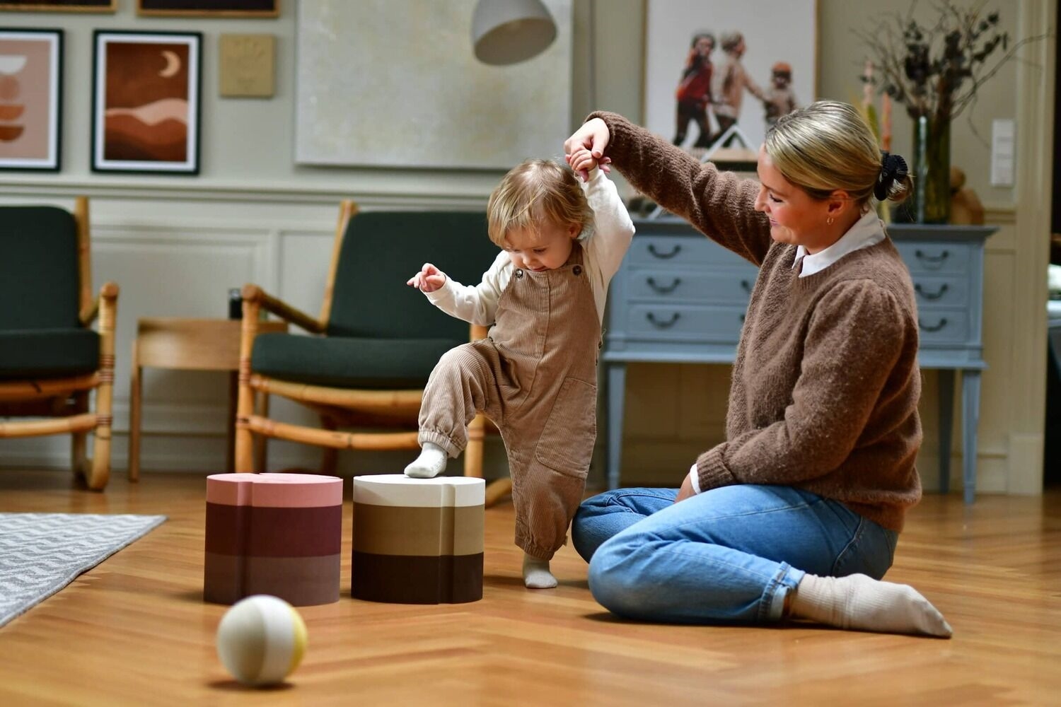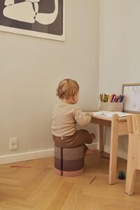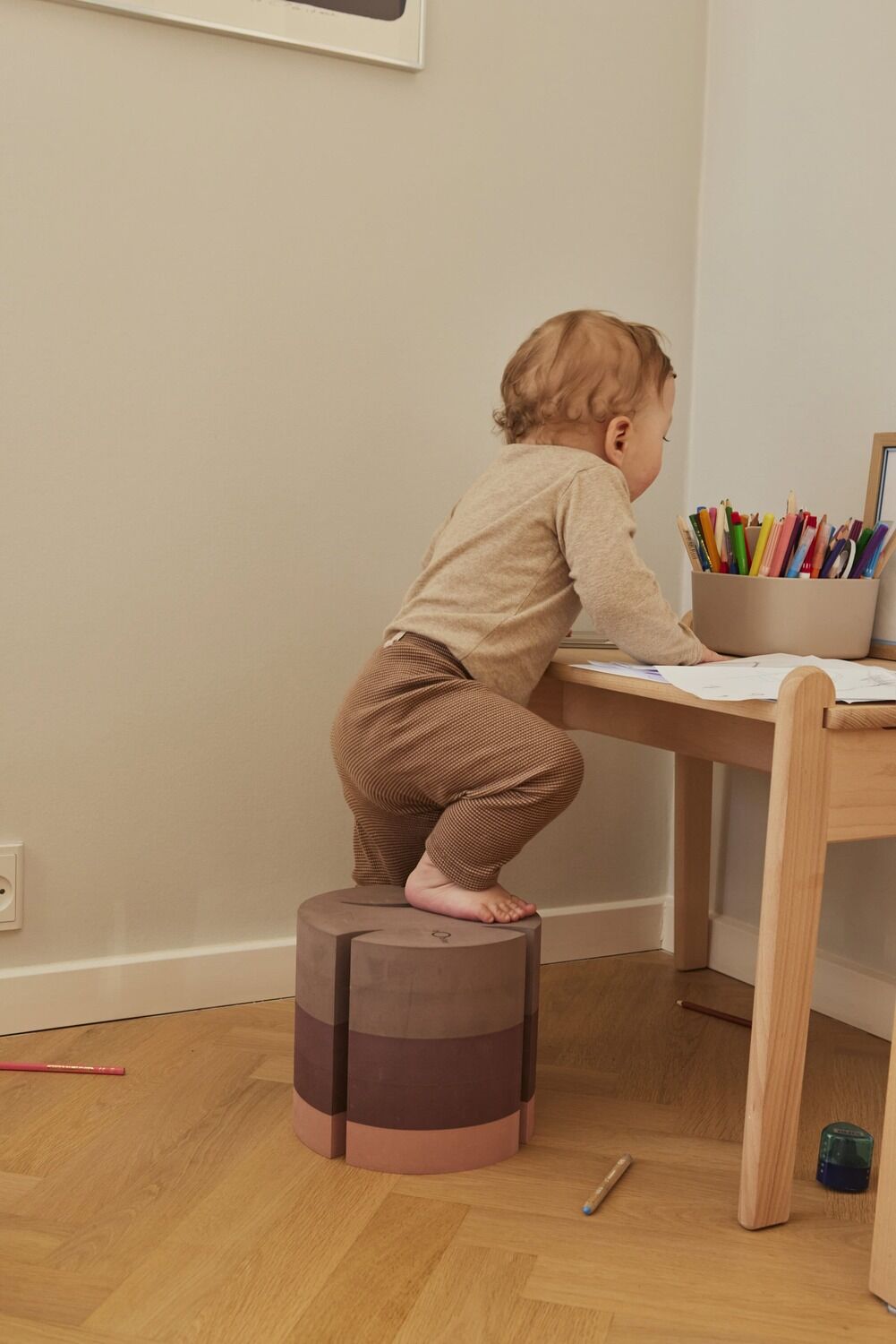 bObles Fisk M er fremstillet i skridsikkert EVA-skum, der giver sikkerhed under leg og bevægelse. Den cylindriske form med fiskelignende udskæringer i rosa og brune nuancer fungerer som vippe, skammel og støtte til børns motoriske udvikling.