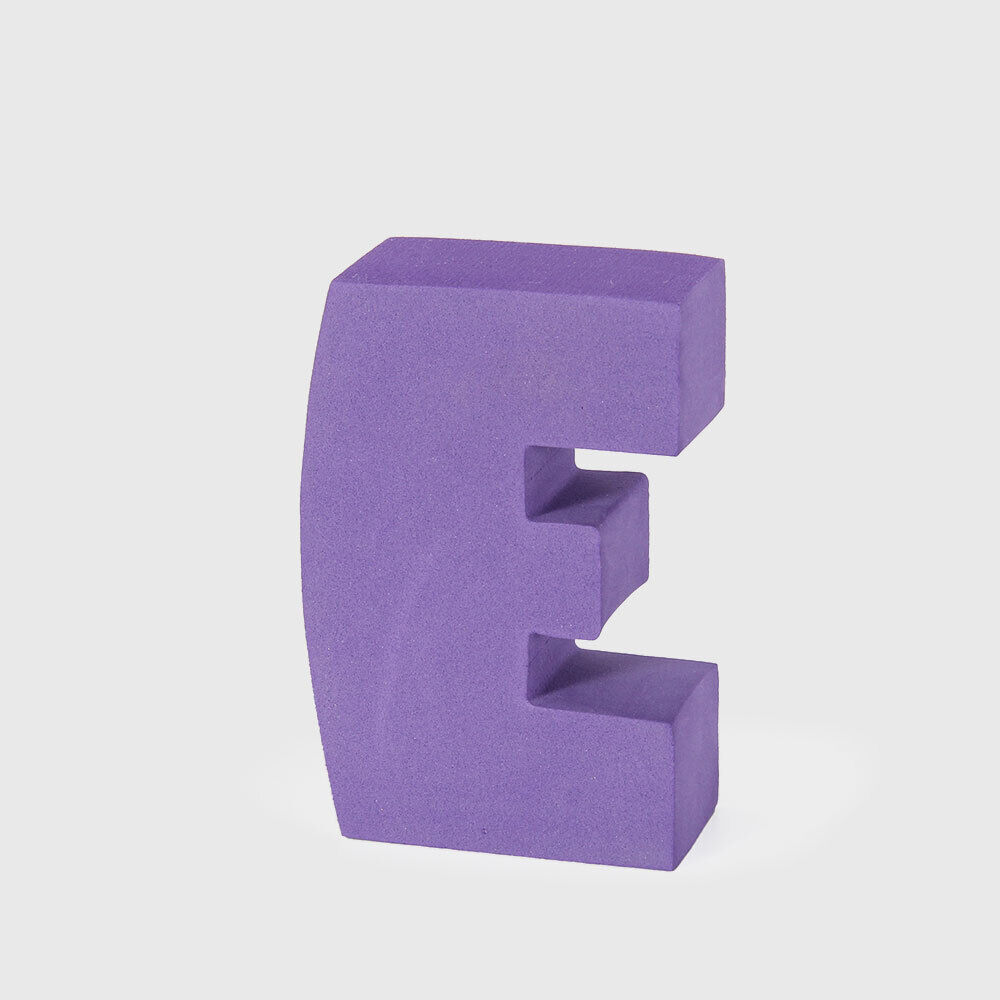 Dette bogstav E er formet som en solid blok i lilla og er en del af bObles alfabet. Den lilla farve markerer, at E er en vokal, mens konsonanterne i serien er blå. Denne farvekodning hjælper børn med at skelne mellem bogstavtyper under leg og læring.