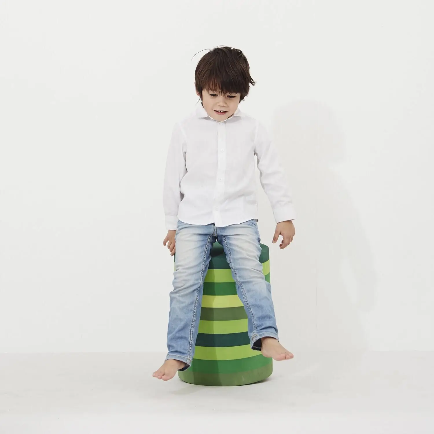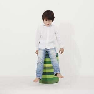 Denne cylinderformede tumlemøbel i nuancer af grøn har en rund bund, der sætter gang i bevægelsen. Når dit barn sidder, vipper eller balancerer på Orm, styrkes ryggen og holdningen naturligt gennem leg. Designet inviterer til aktiv brug, hvor kroppen konstant justerer balancen.