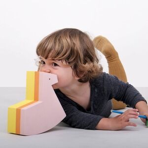 Minihestens størrelse er tilpasset små hænder, hvilket gør det nemt for børn at lege selvstændigt. Den kan også medbringes til badet, hvor den flyder på vandet og tilføjer en ekstra dimension til badetiden. Materialet er flerfarvet med lag af lyserød, orange og gul, som skaber visuel interesse uden at være overvældende.