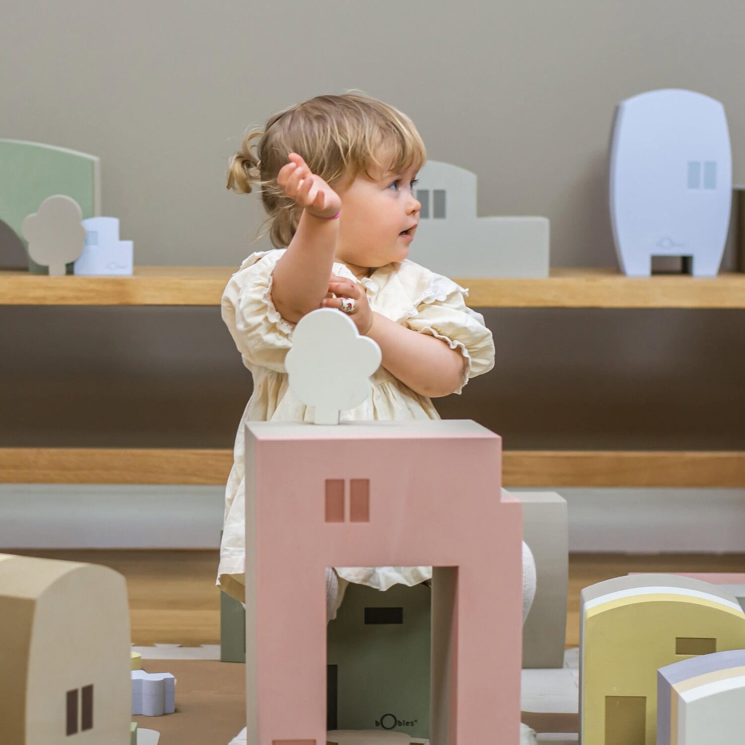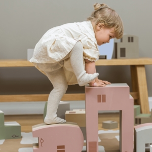 Town City Tower er i to dele. De kan bruges sammen eller hver for sig som skamler til at sidde eller gå på. Hvis den lille del trækkes lidt ud, kan City Tower bruges af barnet som en trappe, når køkkenbordet eller håndvasken skal nås - den perfekte hjælper i alle husets rum. Du kan bruge Town City Tower alene, eller du kan bruge det med andre Town-huse og lege med det på tumlegulvet med vejbaner. Byg din egen by, måske kan du genkende mormors hus eller din bedste vens? Town er perfekt til både aleneleg og sammen med andre. Det stimulerer både fantasi og motorik, samtidig med at det giver anledning til samtale mellem barn og voksen om barnets plads i verden, det nære miljø, trafikregler, m.v. Town forener alt det bedste fra vores klassiske designs med en ekstra dimension. Town-kollektionen er skabt til familiens lille arkitekt som en hyldest i børnehøjde til Norden og de nordiske byer København, Stockholm, Oslo, Helsinki og Tórshavn. Her kan tumles, vippes og siddes på byens tage og leges kreativt med de forskellige Town-dele, så barnet kan bygge sin egen lille by.