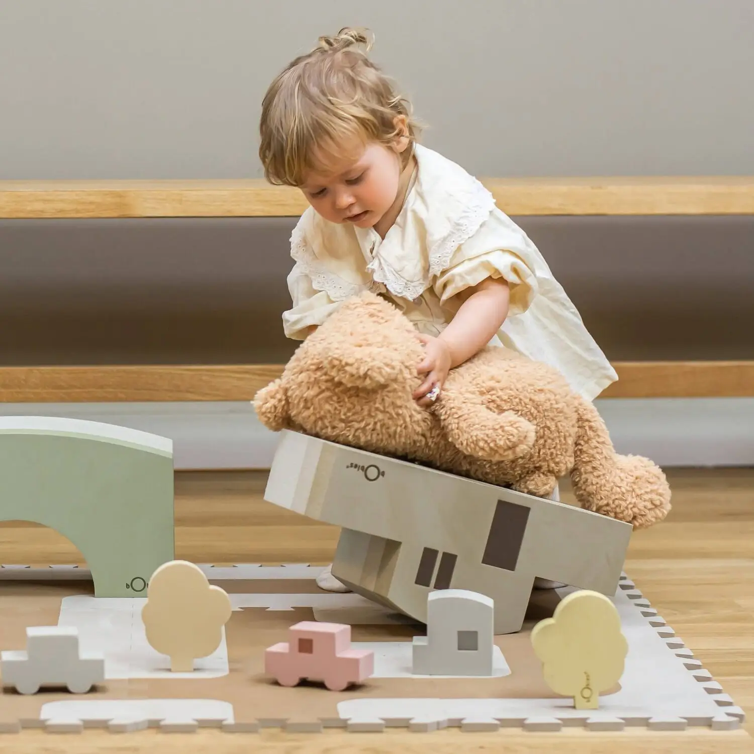 Town House Factory har mange forskellige funktioner. Det kan bruges som skammel, eller som en trappe. Vendes det på hovedet, får barnet en vippe til at sidde, ligge på maven, stå og balancere på. Dit barn kan bruge Town House Factory alene, eller sammen med andre Town-huse og lege med det på tumlegulvet med vejbaner. Byg din egen by, måske kan du genkende mormors hus eller din bedste vens? Town er perfekt til både aleneleg og sammen med andre. Det stimulerer både fantasi og motorik, samtidig med at det giver anledning til samtale mellem barn og forælder om barnets plads i verden, det nære miljø, trafikregler, m.v. Town forener alt det bedste fra vores klassiske designs med en ekstra dimension. Town-kollektionen er skabt til familiens lille arkitekt som en hyldest i børnehøjde til Norden og de nordiske byer København, Stockholm, Oslo, Helsinki og Tórshavn. Her kan tumles, vippes og siddes på byens tage og leges kreativt med de forskellige Town-dele, så barnet kan bygge sin egen lille by.