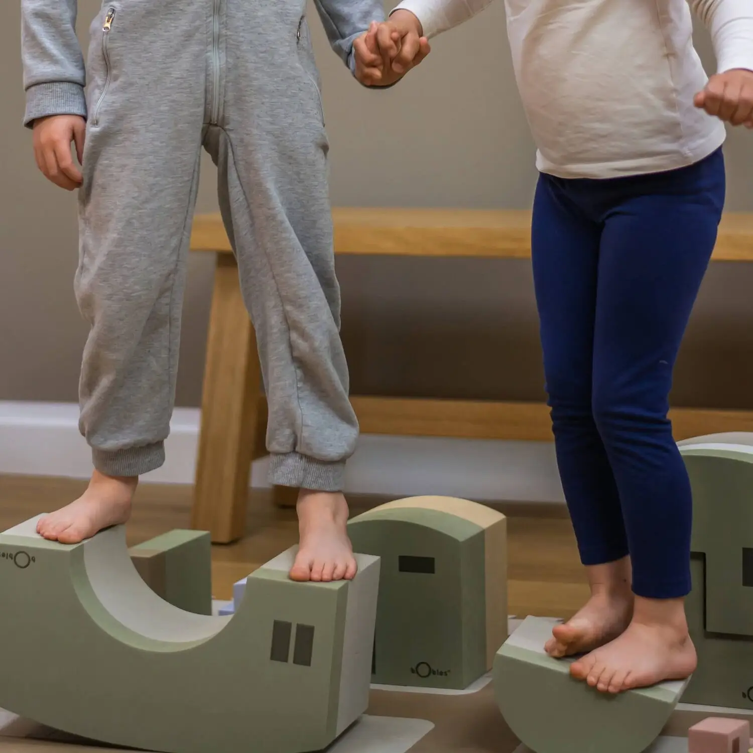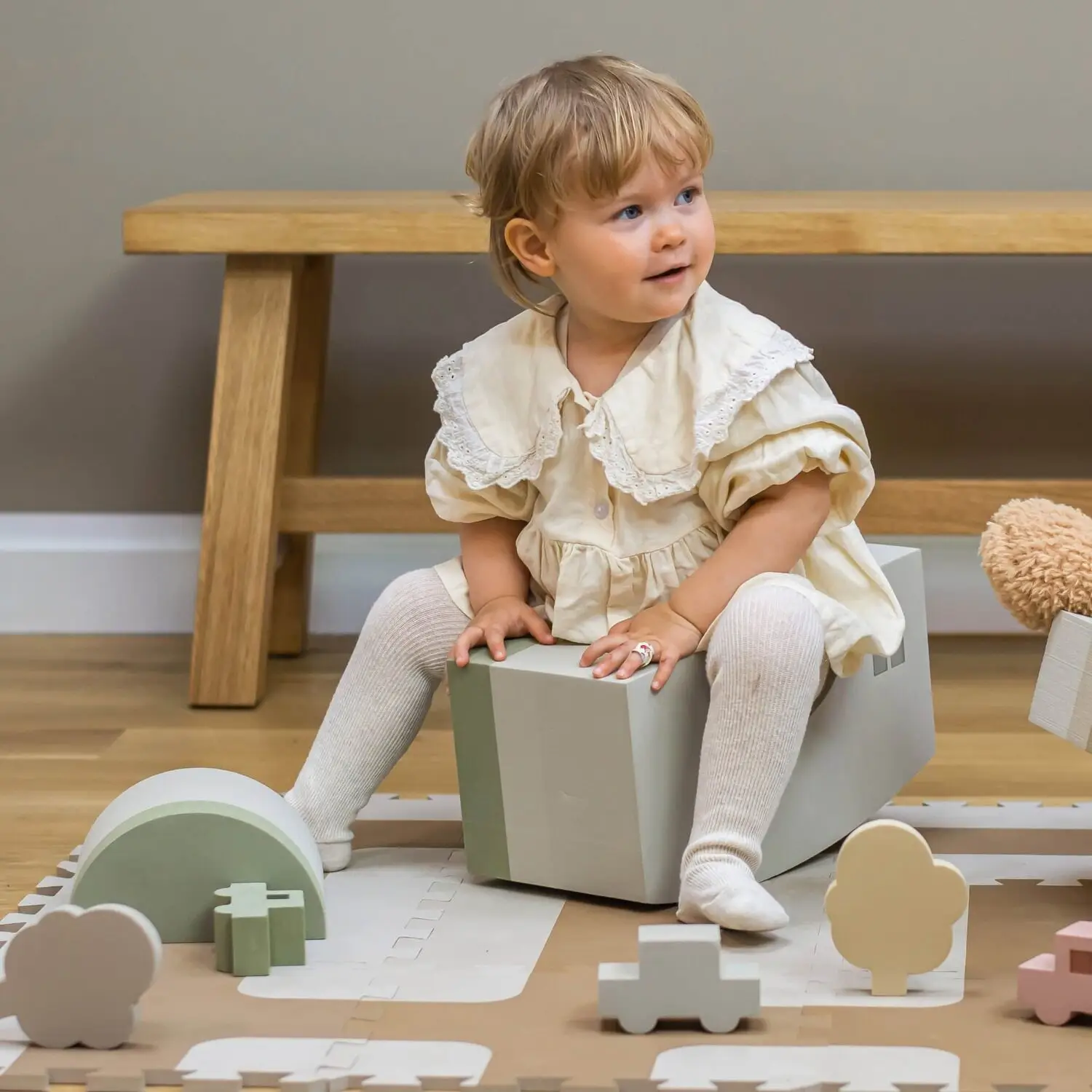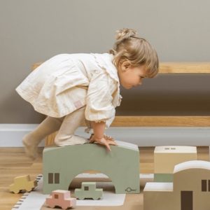 Town House Gate har mange forskellige funktioner og består af to dele. Sammen kan de bruges som skammel, og hvis det vendes på hovedet, får barnet en vippe til at sidde, ligge på maven, eller stå og balancere på. Hvis den lille del tages ud, kan den bruges alene som trædesten til en forhindringsbane, eller den kan lægges foran Town House Gate som en lille trappe. Vendes huset på hovedet uden den lille del, kan barnet sidde i hullet og vippe frem og tilbage. Town House Gate kan bruges alene eller sammen med andre Town-huse til leg på tumlegulvet med vejbaner. Byg din egen by, måske kan du genkende mormors hus eller din bedste vens? Town er perfekt til både aleneleg og sammen med andre. Det stimulerer både fantasi og motorik samtidig med at det giver anledning til samtale mellem barn og voksen om barnets plads i verden, det nære miljø, trafikregler, m.v. Town forener alt det bedste fra vores klassiske designs med en ekstra dimension. Town-kollektionen er skabt til familiens lille arkitekt som en hyldest i børnehøjde til Norden og de nordiske byer København, Stockholm, Oslo, Helsinki og Tórshavn. Her kan tumles, vippes og siddes på byens tage og leges kreativt med de forskellige Town-dele, så barnet kan bygge sin egen lille by.