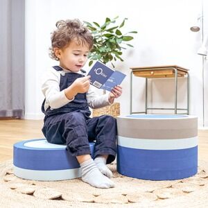 Tumlerøret fungerer både som legetøj og møbel i hjemmet. Den cylindriske konstruktion gør det nemt at rulle rundt og placere, hvor der er brug for det. Det todelte farvedesign i blå nuancer passer ind i de fleste børneværelser uden at dominere rummet.