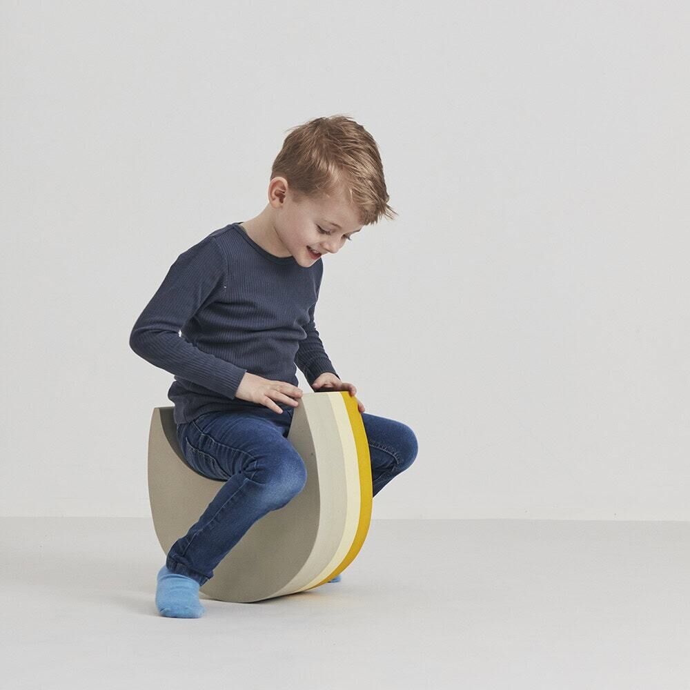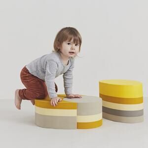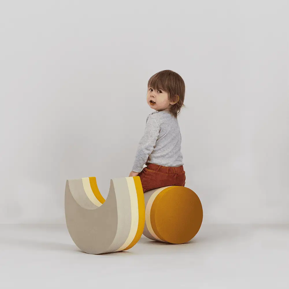 De to dele åbner for fantasifuld leg, hvor dit barn selv bestemmer, hvordan legetøjet bruges. Det kan være en gyngestol, en bro, et bord eller noget helt tredje. Farvekombinationen af orange, gul og beige stimulerer synet, mens den simple form gør det let at integrere i forskellige legeaktiviteter.