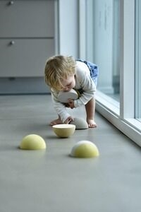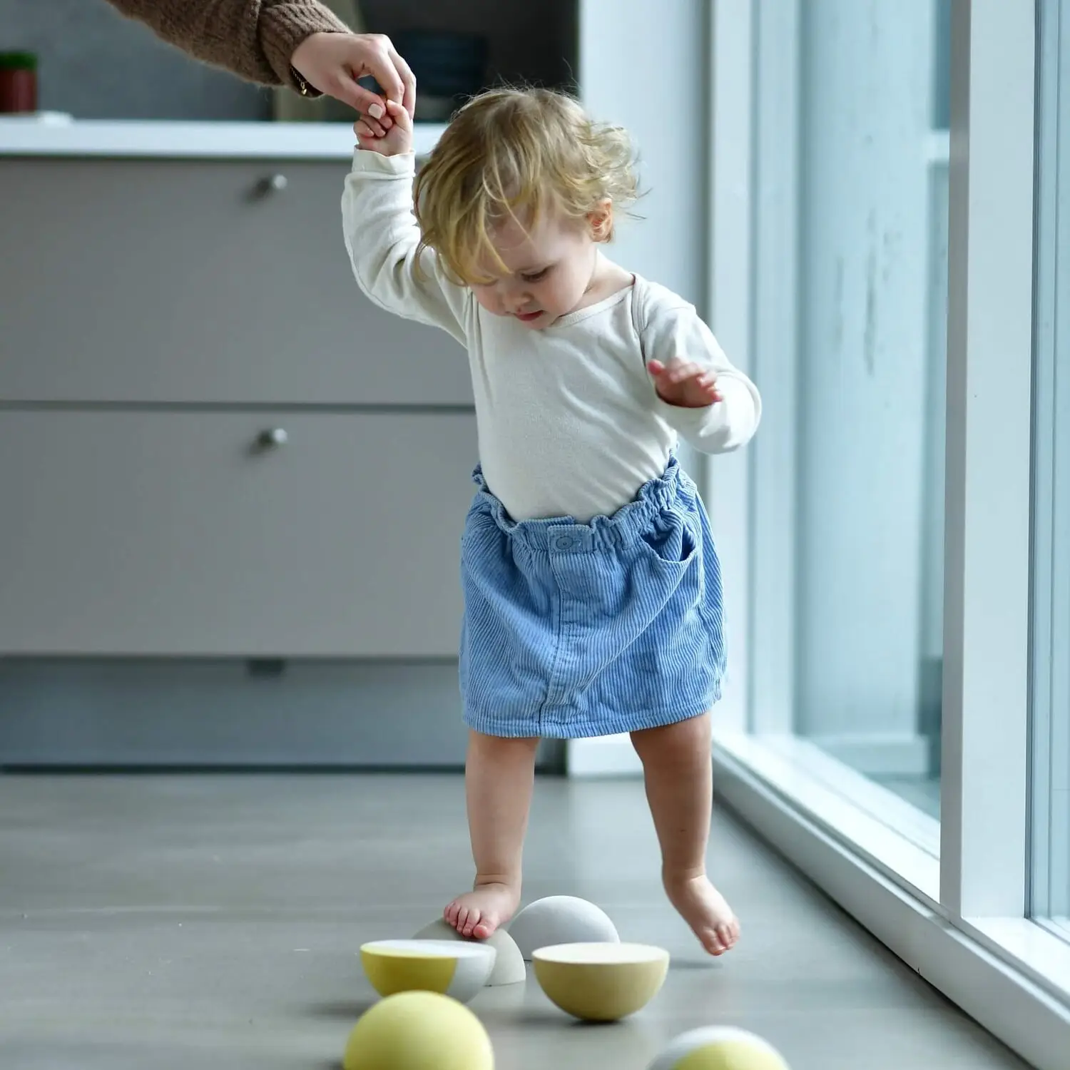 Farverne i gul og beige gør sættet visuelt behageligt i hjemmet, mens funktionen forbliver i fokus. Stenene kan arrangeres i forskellige mønstre og bruges individuelt eller sammen, hvilket giver fleksibilitet i legen og tilpasning til barnets udviklingsniveau.