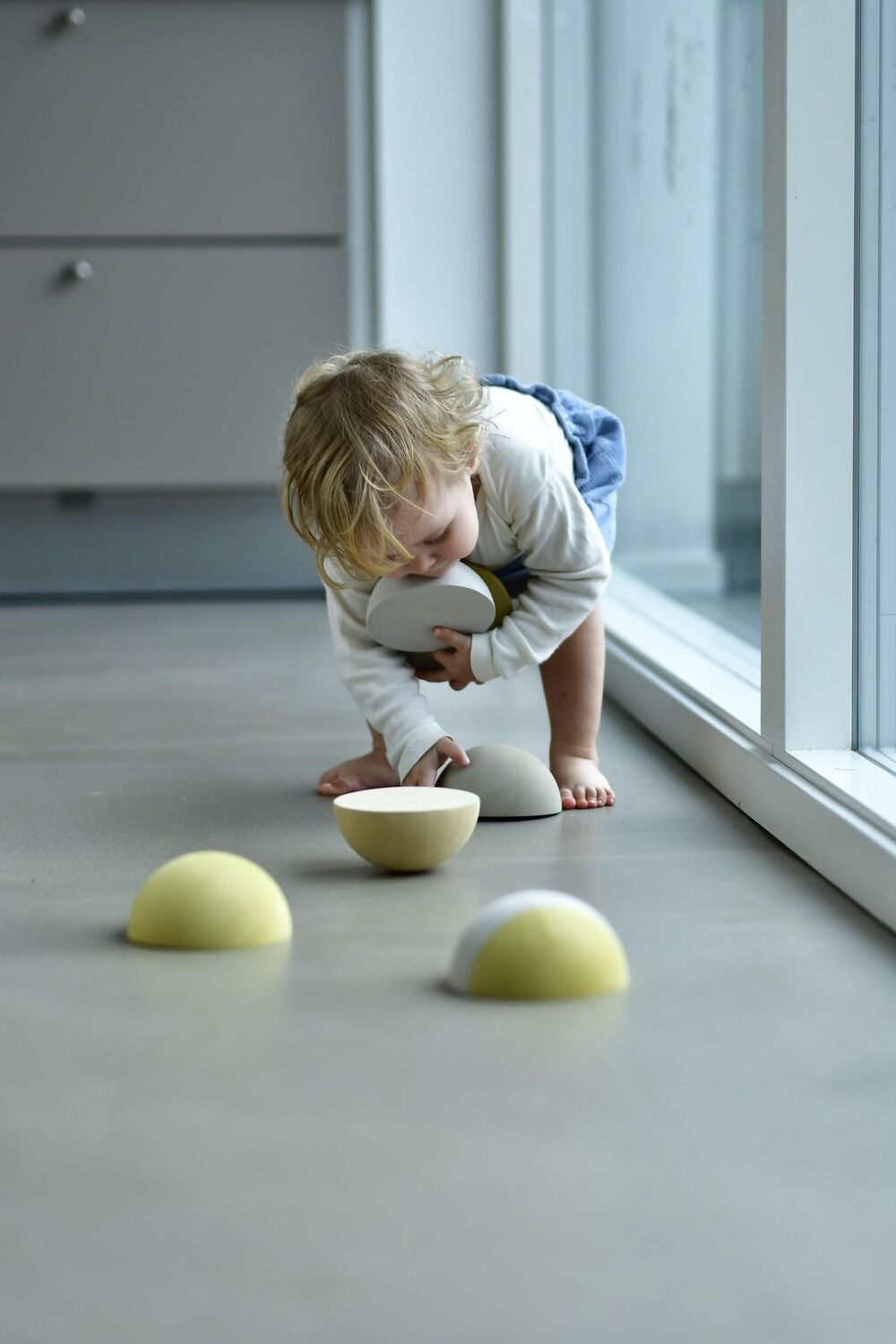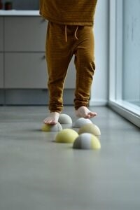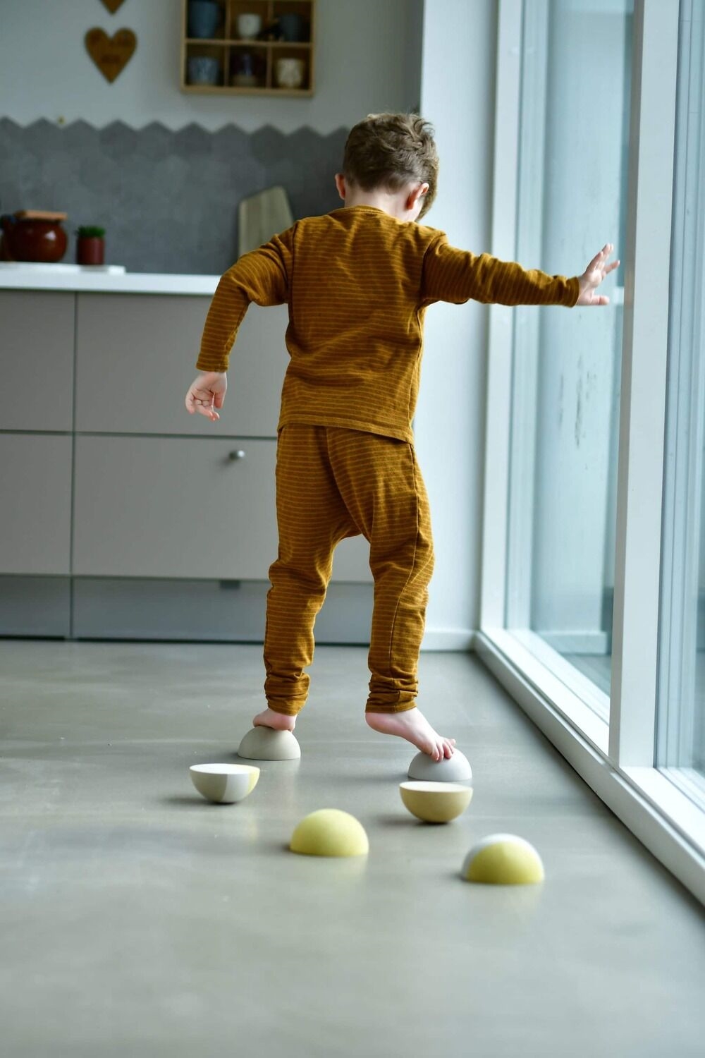 Dette tumlesten-sæt er designet til balanceøvelser, der hjælper børn med at udvikle koordination, styrke og kropsbevidsthed. Det halvkugleformede design skaber en udfordrende overflade, som inviterer til leg og motorisk udfoldelse i hjemmet.