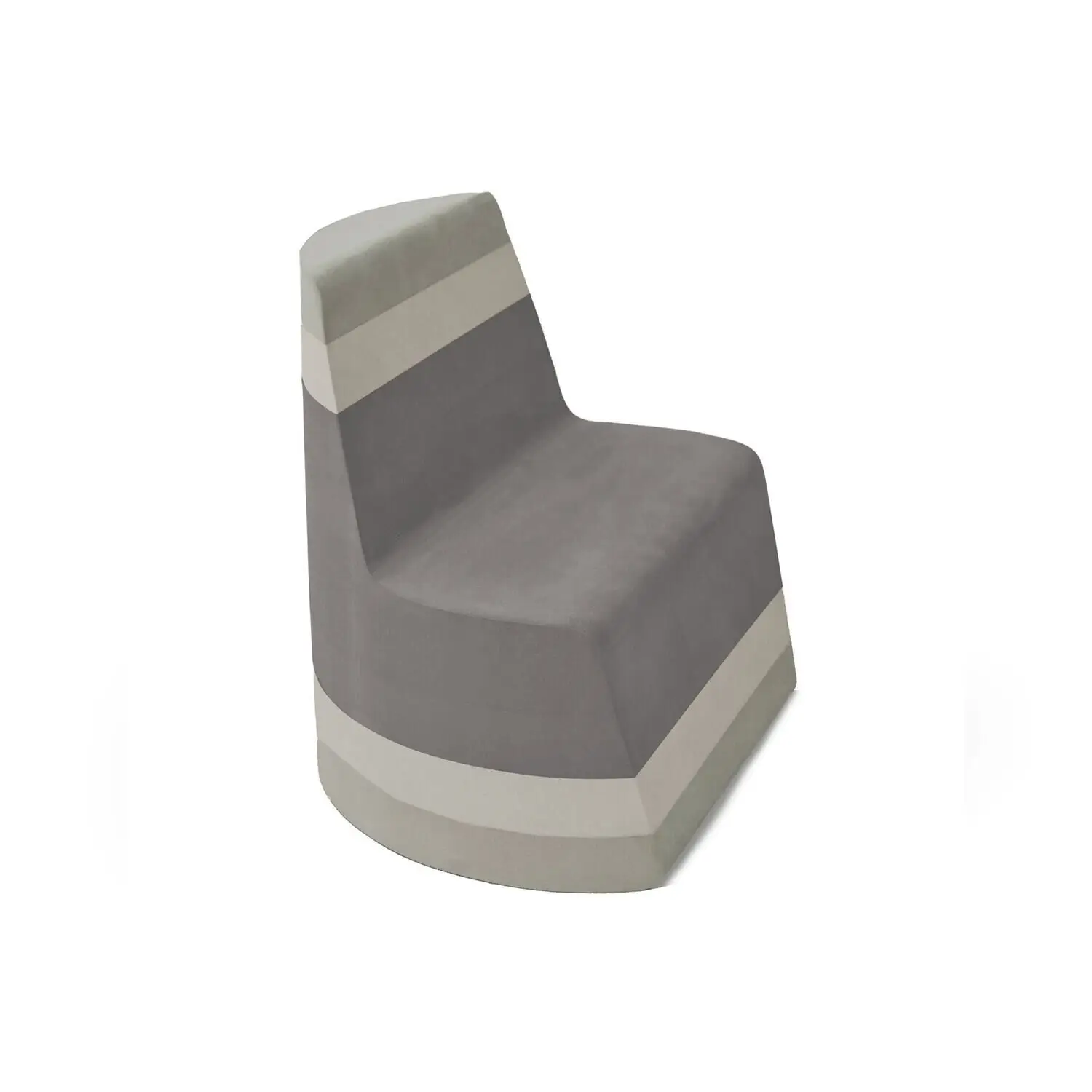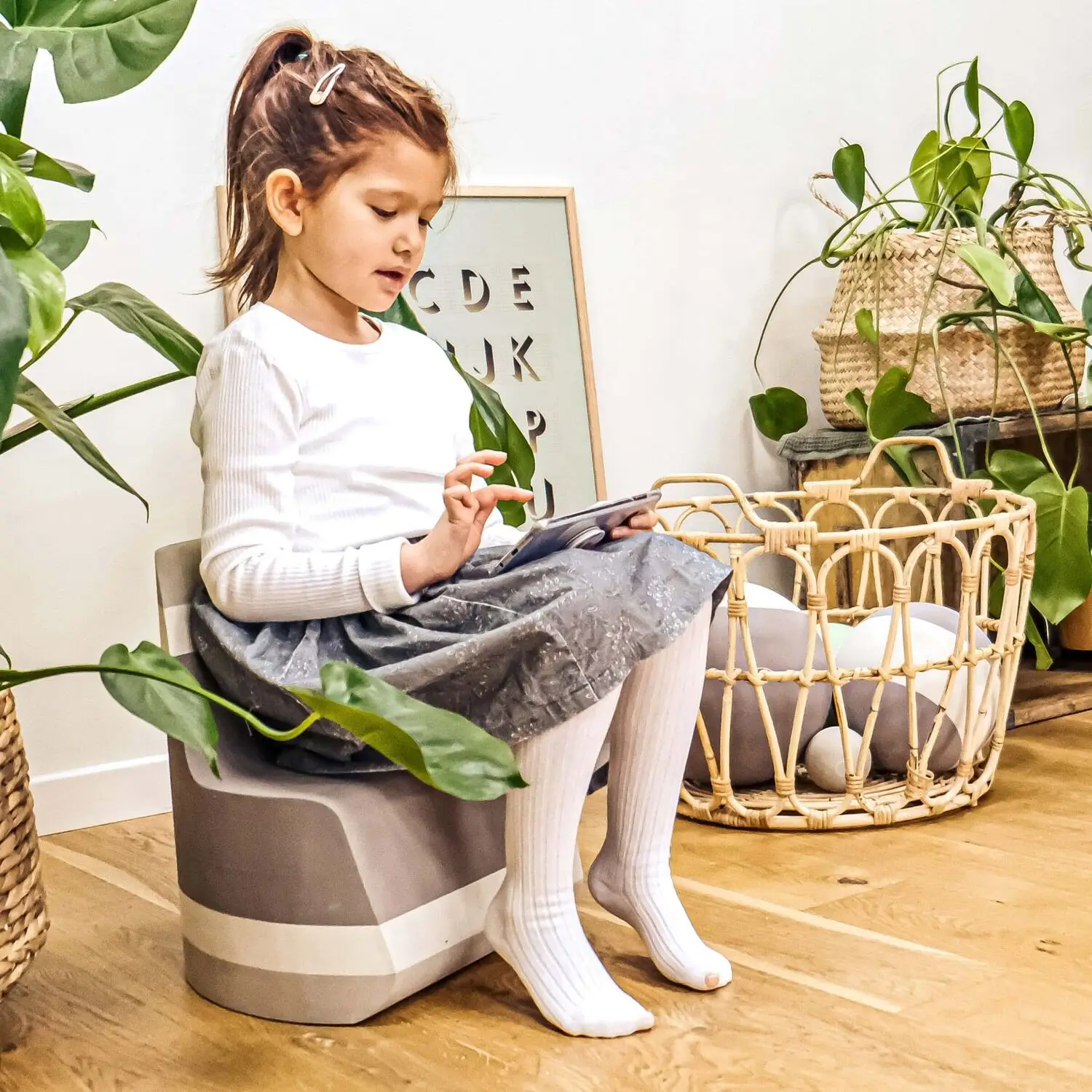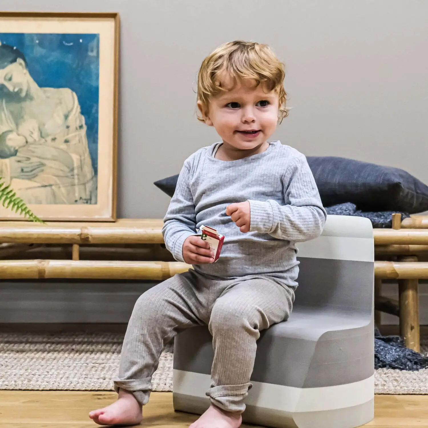 Bobles - Twin Grey er en børnestol med en sædehøjde på 18 cm, designet til små børn. Den er fremstillet af let EVA-skum, som gør den nem at flytte rundt i hjemmet. Stolen har et buet design i grå farve med hvide striber, og den er en del af bObles cirkelserie.