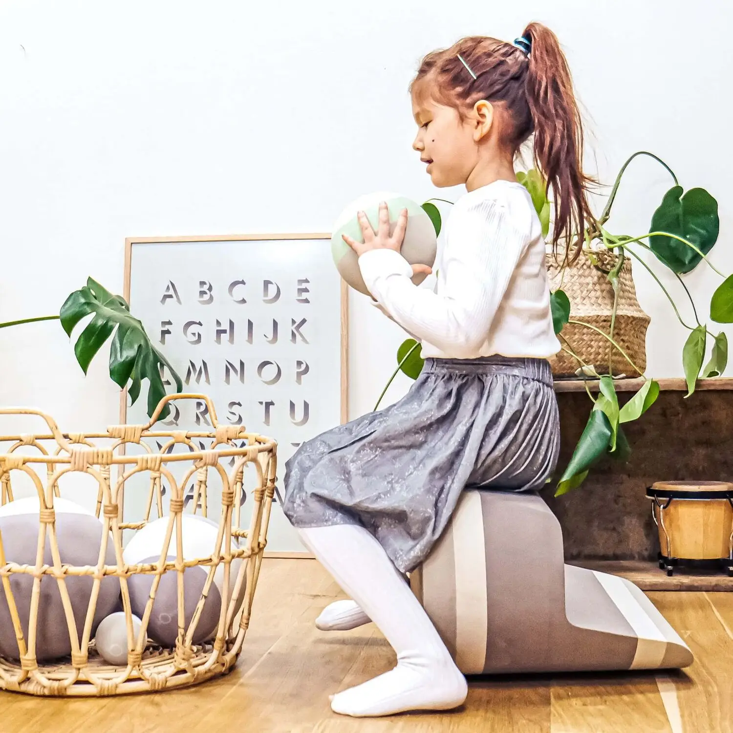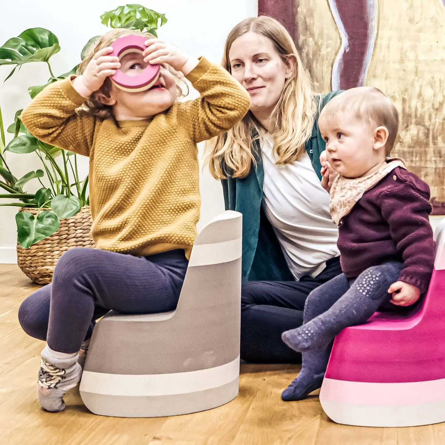 Stolen kan lægges på ryggen for at skabe en vippefunktion, som tilføjer en ekstra legemulighed. Du kan også sammensætte den med en anden Twin for at danne en cylinder. Designet pynter i hjemmet som en del af bObles cirkelserie, så den fungerer både som møbel og legetøj.
