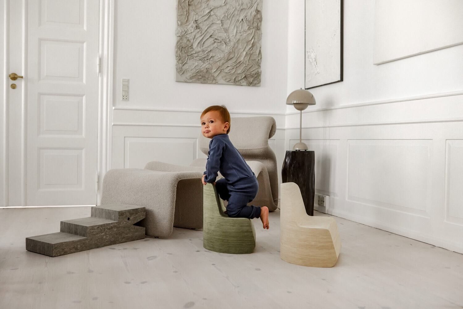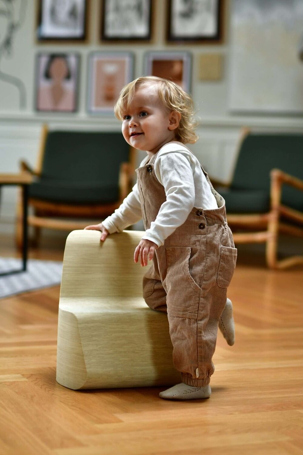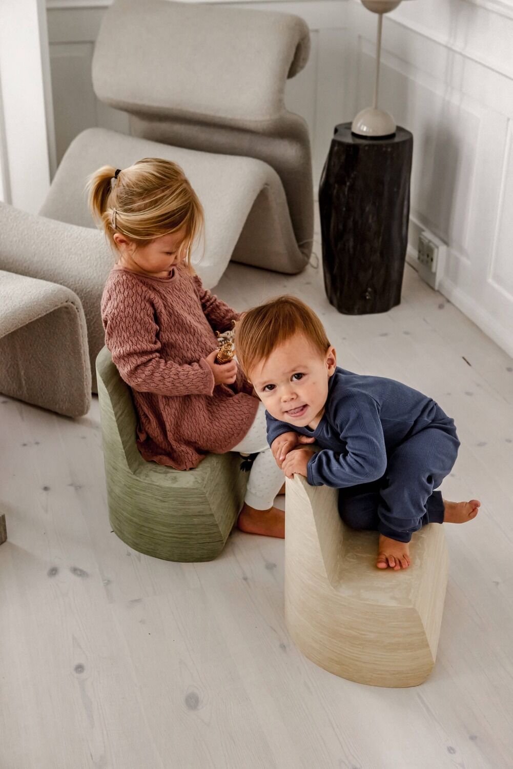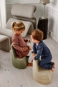 Stolen kan lægges på ryggen for at skabe to vippe-siddepladser, hvilket tilføjer et interaktivt element til legen. Den er designet til at kunne sammensættes med en anden Twin for at danne en hel cylinder, så du kan tilpasse møblementet efter dit barns behov.