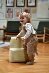 En halv cylinder i lys sandfarve, der fungerer som både siddeplads og lille bord. Med en siddehøjde på 18 cm passer den til små børn, og det lette EVA-skum gør den nem at flytte rundt efter behov.