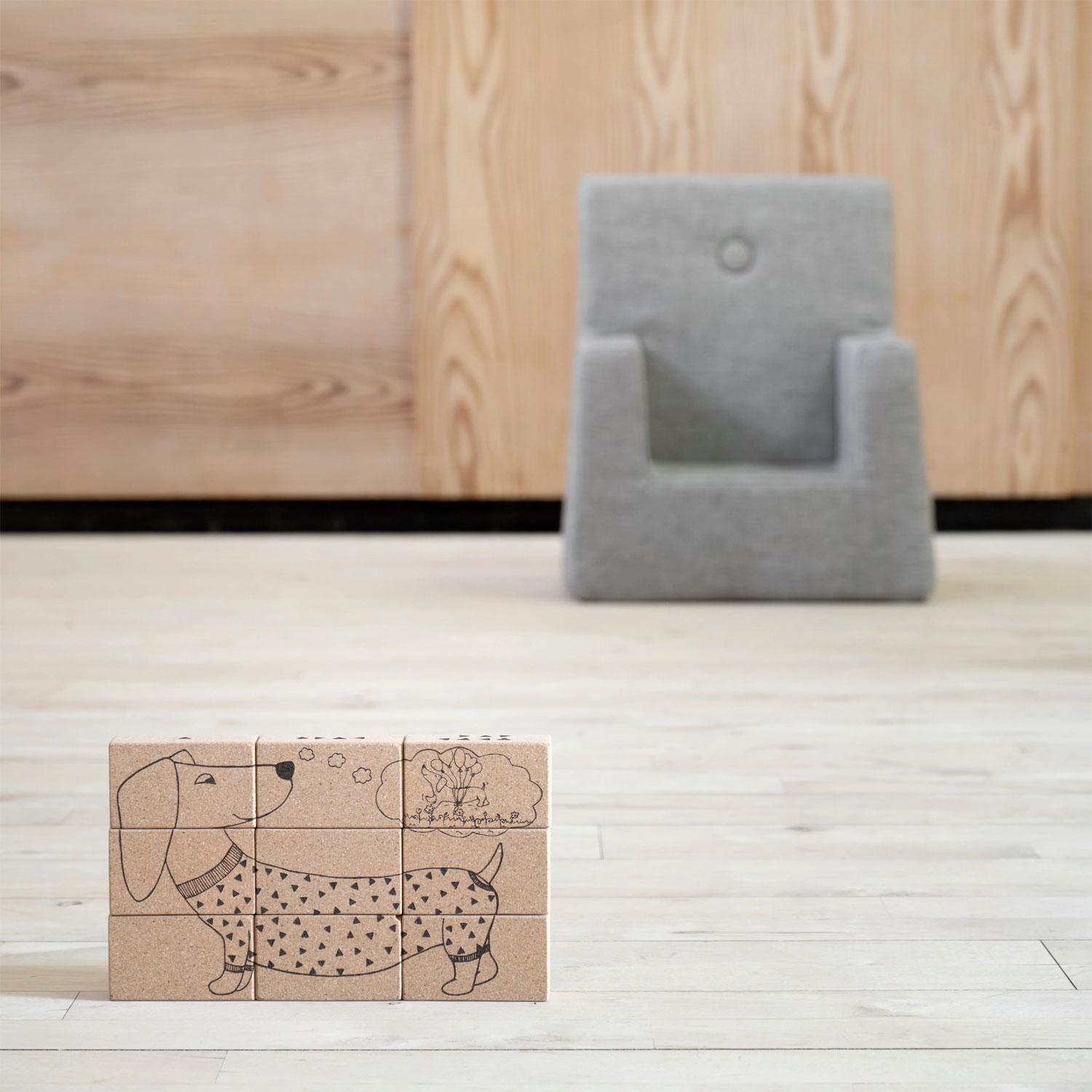 Disse ni korkklodser er mere end bare byggeklodser – de er skabt som en sjov og lærerig puslespilsoplevelse, der udvikler sig sammen med dit barn. Hver klods har laserprintede sider med motiver, der stimulerer tidlig læring gennem leg.